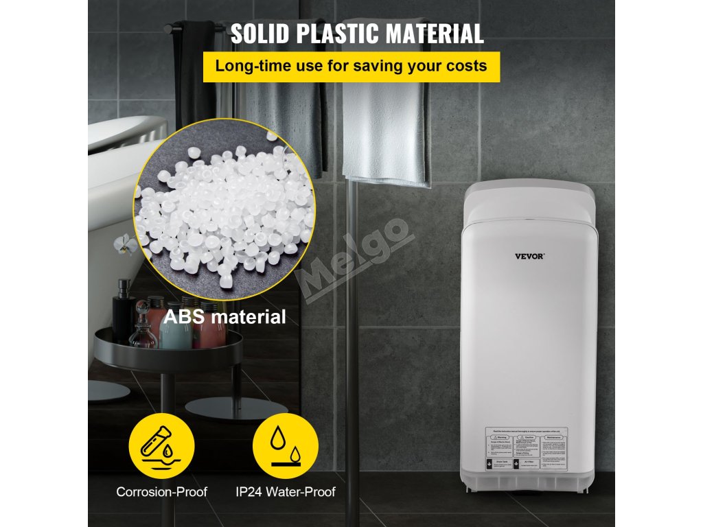 Naše komerční sušička má módní bílé provedení s hladkým povrchem. Kromě toho se sušák na ruce snadno udržuje díky stabilní a odolné konstrukci z ABS.
