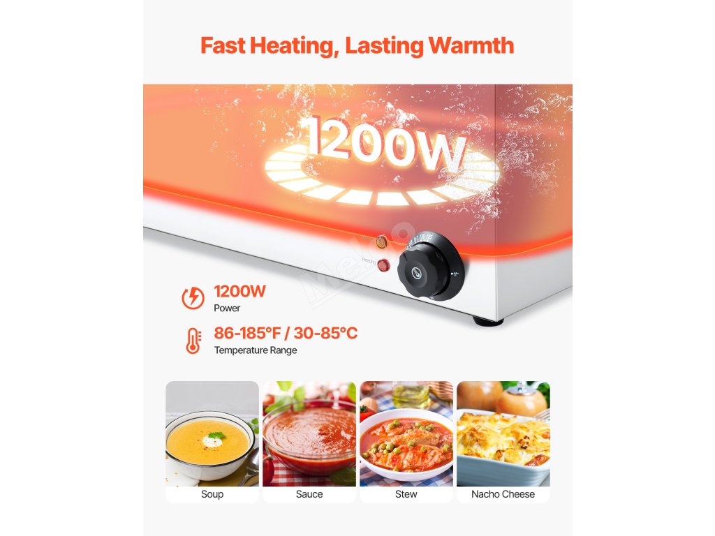 Tento dvouplotýnkový ohřívač potravin z nerezové oceli má konstrukci odolnou proti spálení za sucha a systém resetování, který chrání před poškozením. Teplotní rozsah 86 - 185℉ / 30 - 85 ℃ umožňuje zvolit ideální nastavení, aby bylo jídlo kdykoli horké a připravené k servírování.