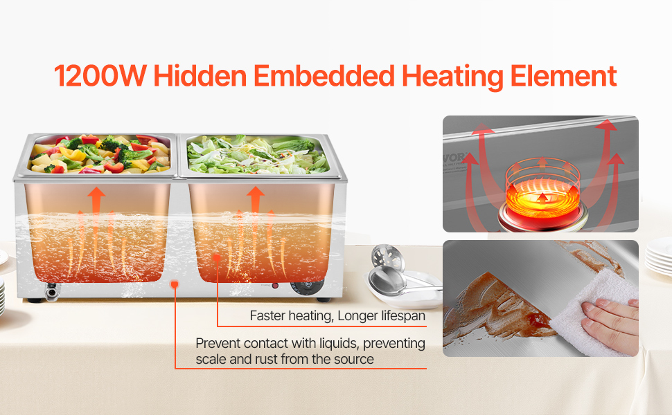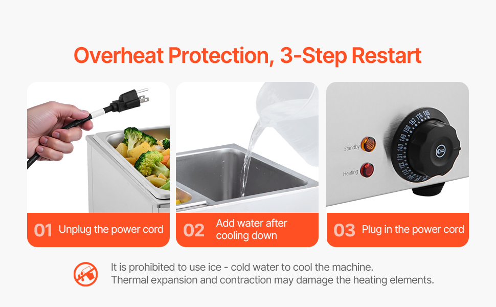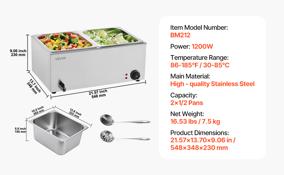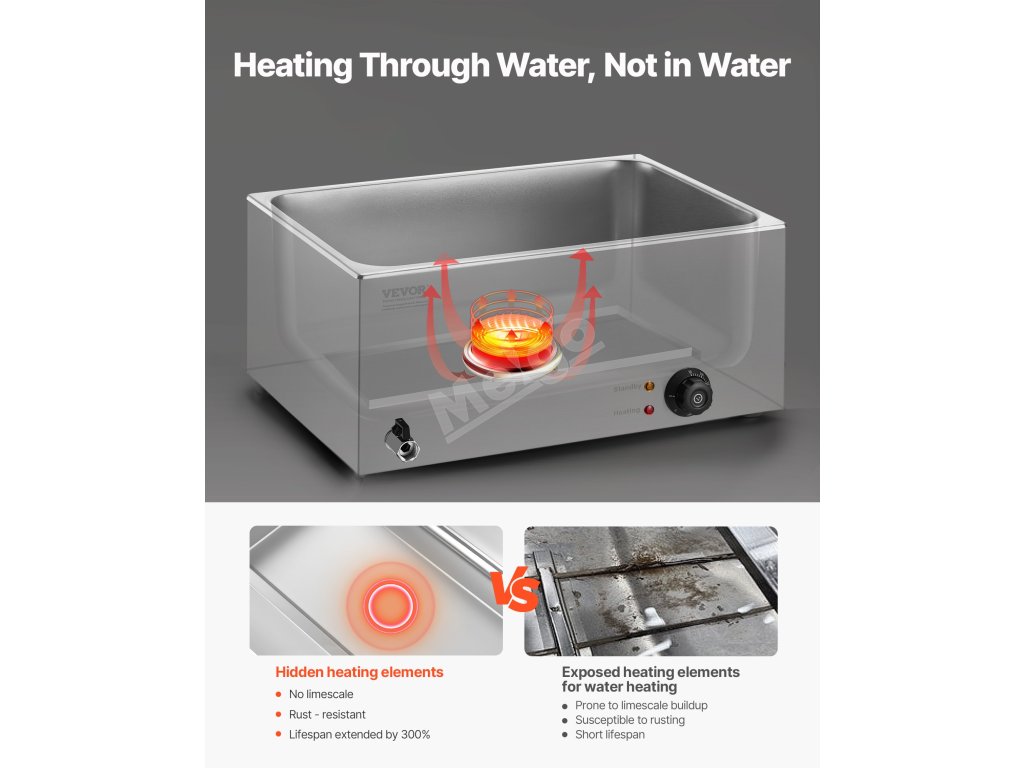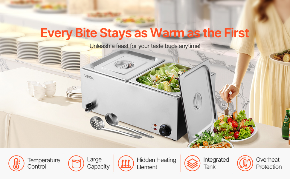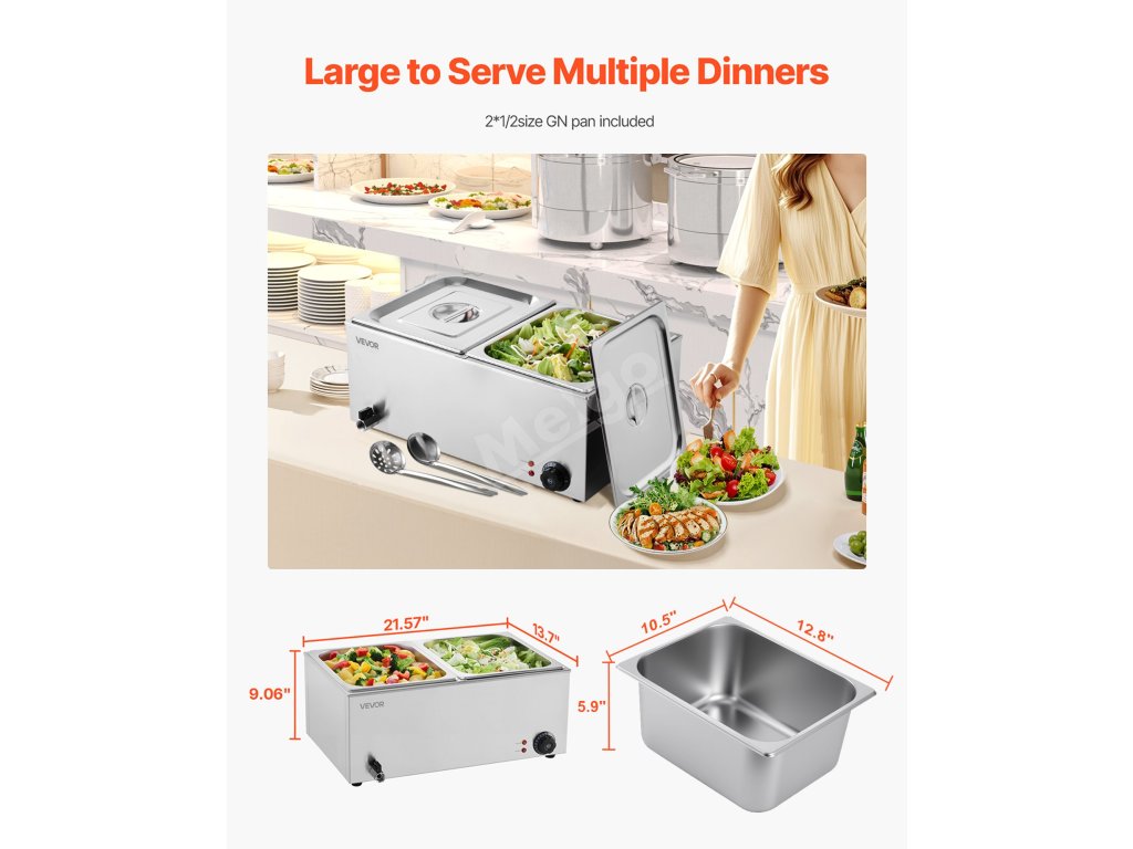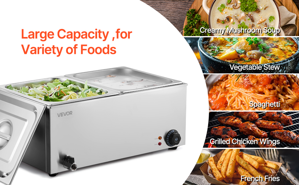 Náš komerční ohřívač potravin je dodáván s 18qt/17L nádobami na potraviny (2*1/2) spolu s odpovídajícími víky, což vám umožní ohřívat více potravin najednou. Udrží vaše chutné jídlo trvale teplé po delší dobu, což je ideální pro vytížené komerční kuchyně.