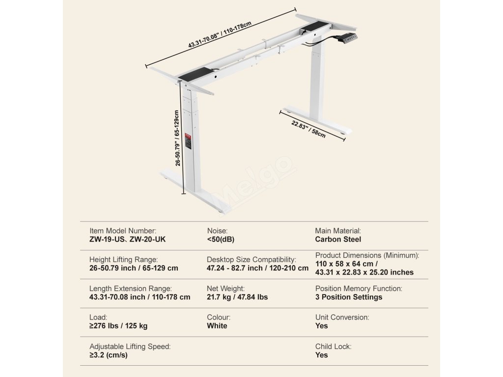 Elektrický rám pro stojací stůl, dvoumotorový, 66–129 cm, bílý