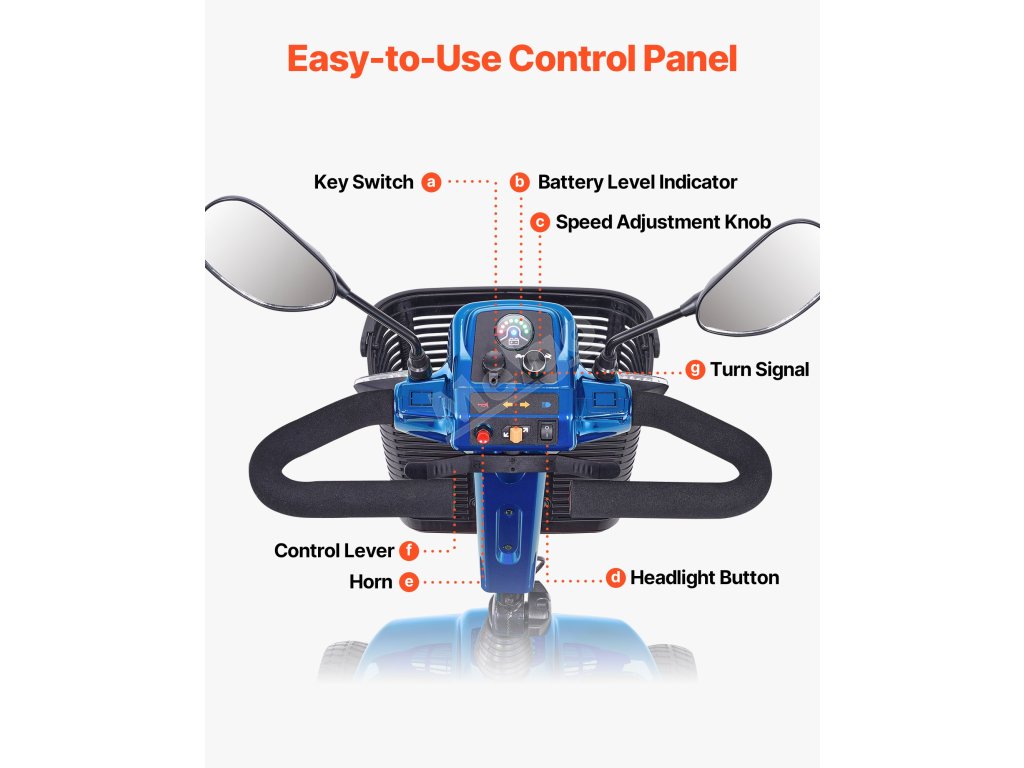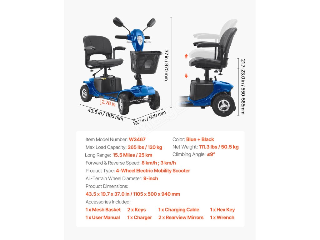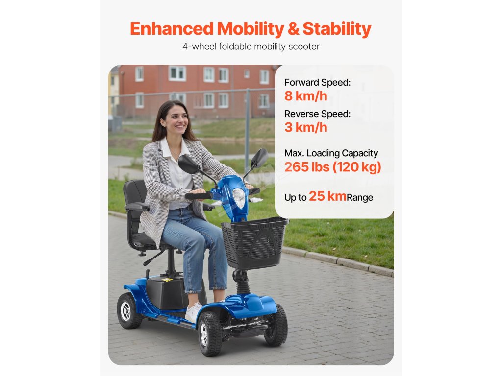 Čtyřkolový skládací skútr VEVOR unese až 120 kg a nabízí spolehlivou mobilitu pro seniory, dospělé a osoby se zdravotním postižením. Baterie 24V 20Ah zajišťuje prodloužený dojezd až 25 km na jedno nabití a poskytuje spolehlivou stabilitu a silnou oporu pro plynulou mobilitu.