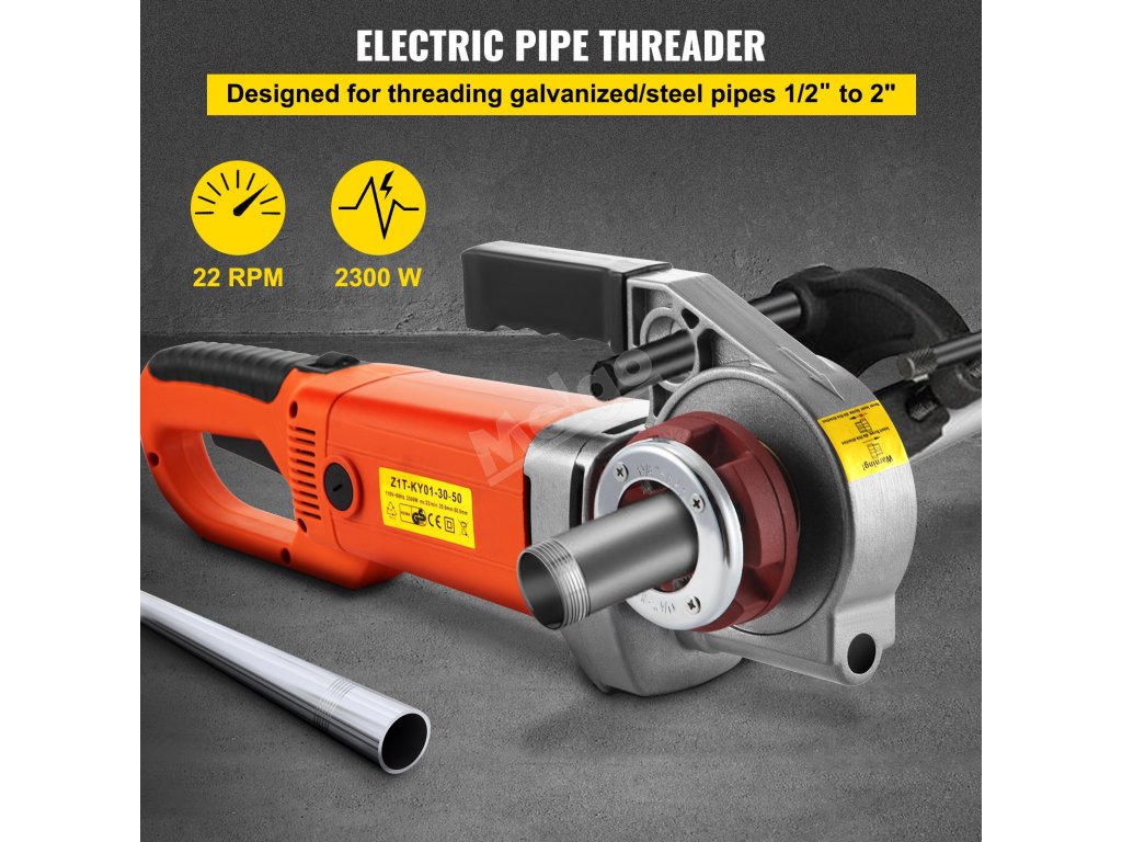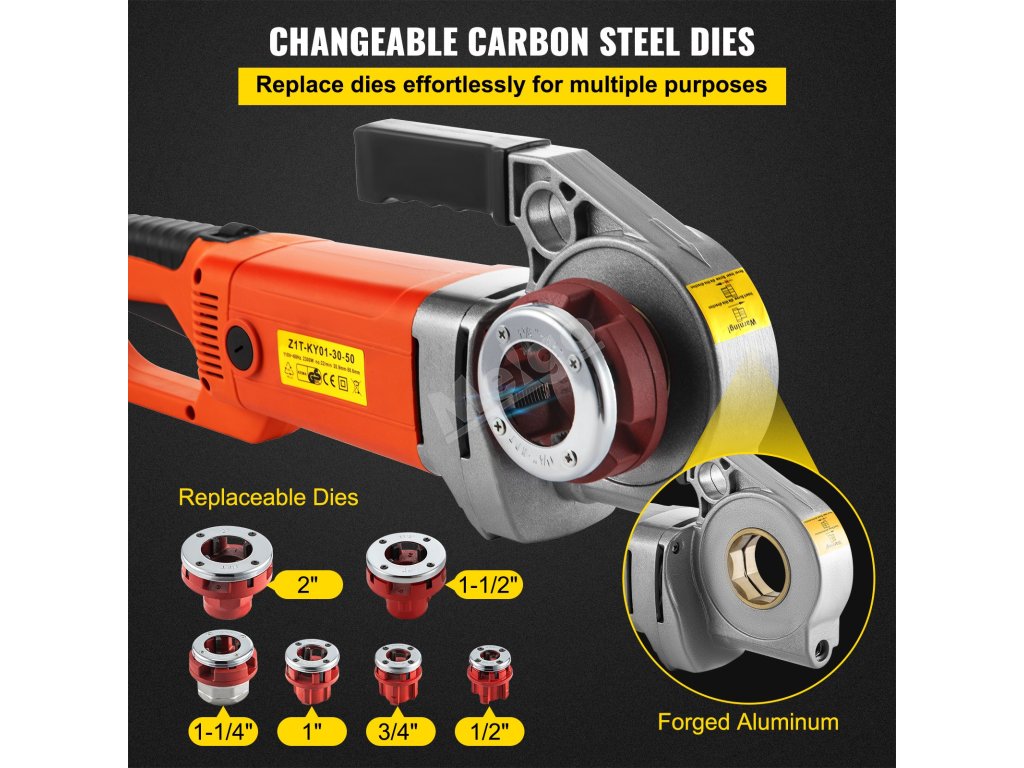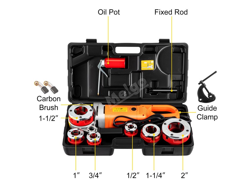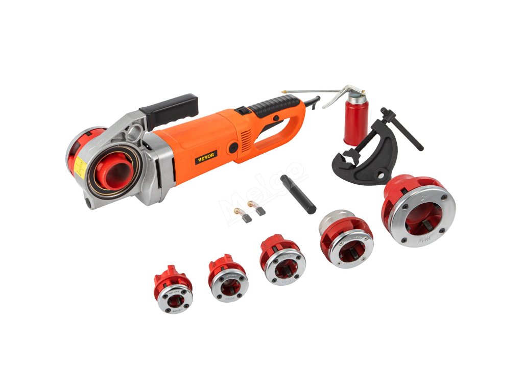 Dva vyměnitelné kartáčky. Když se práce vymkne kontrole, použijte opěrné rameno a trubkovou svorku. Nezapomeňte použít olej na řezání závitů, abyste se ochladili a urychlili práci.