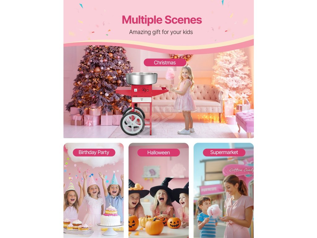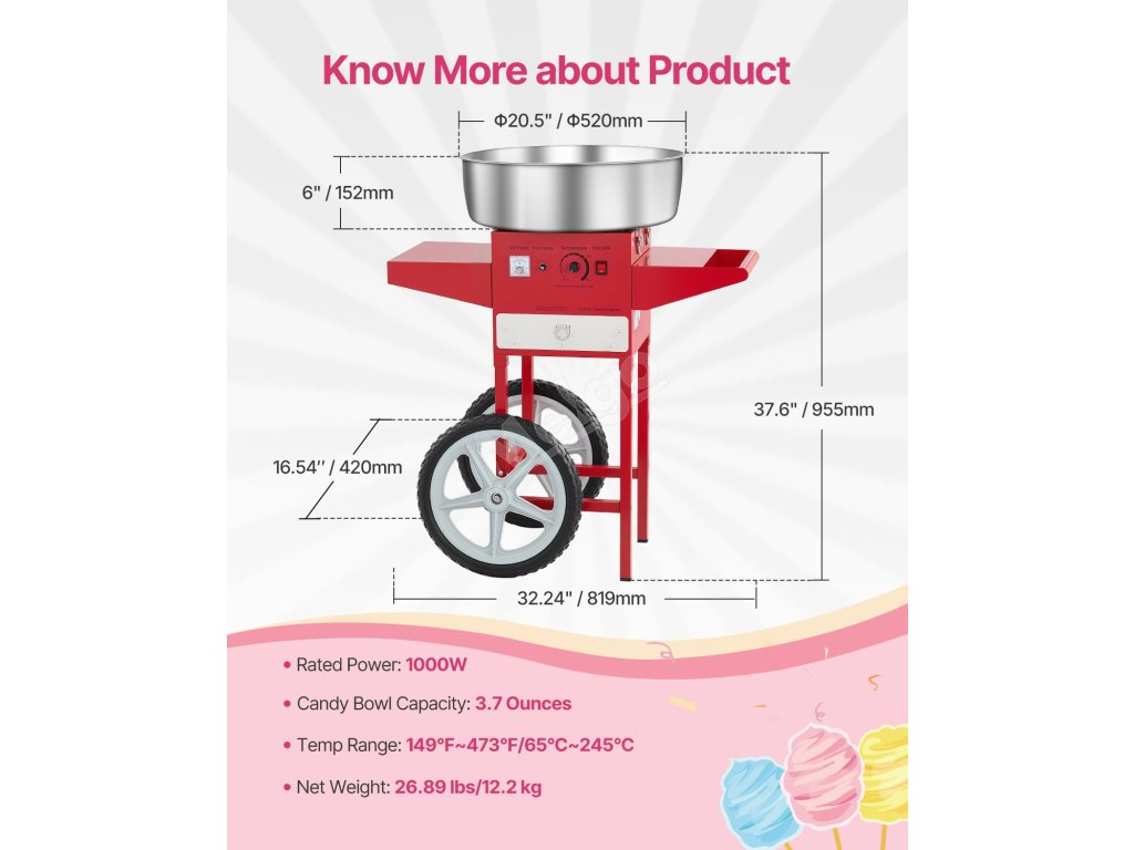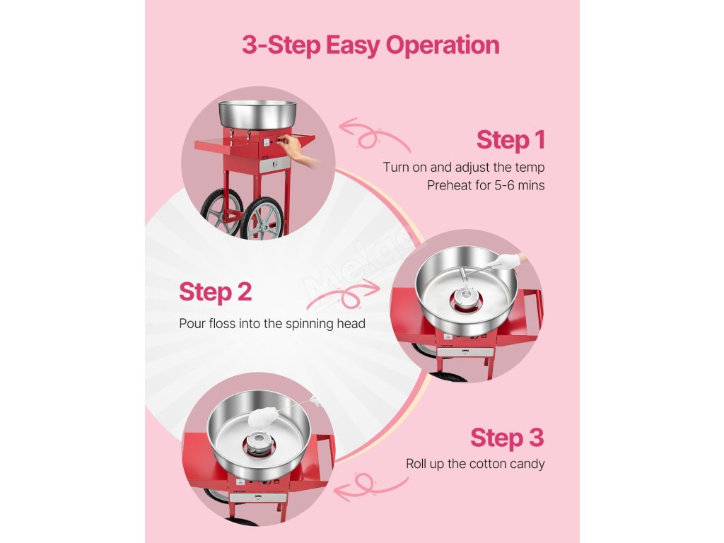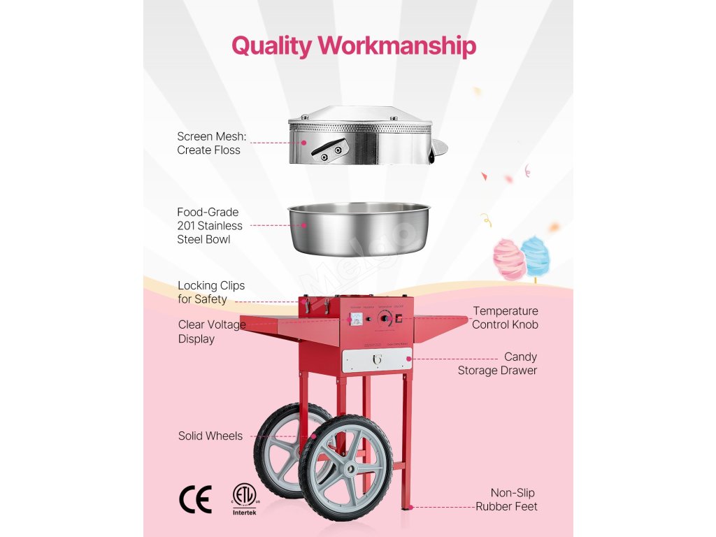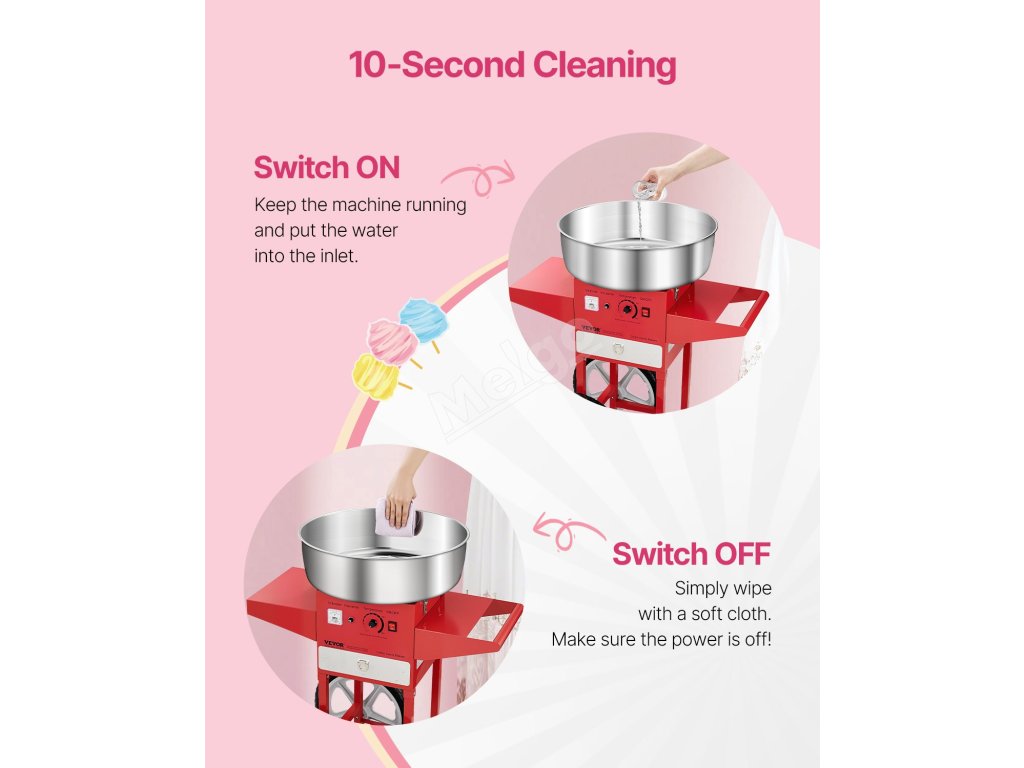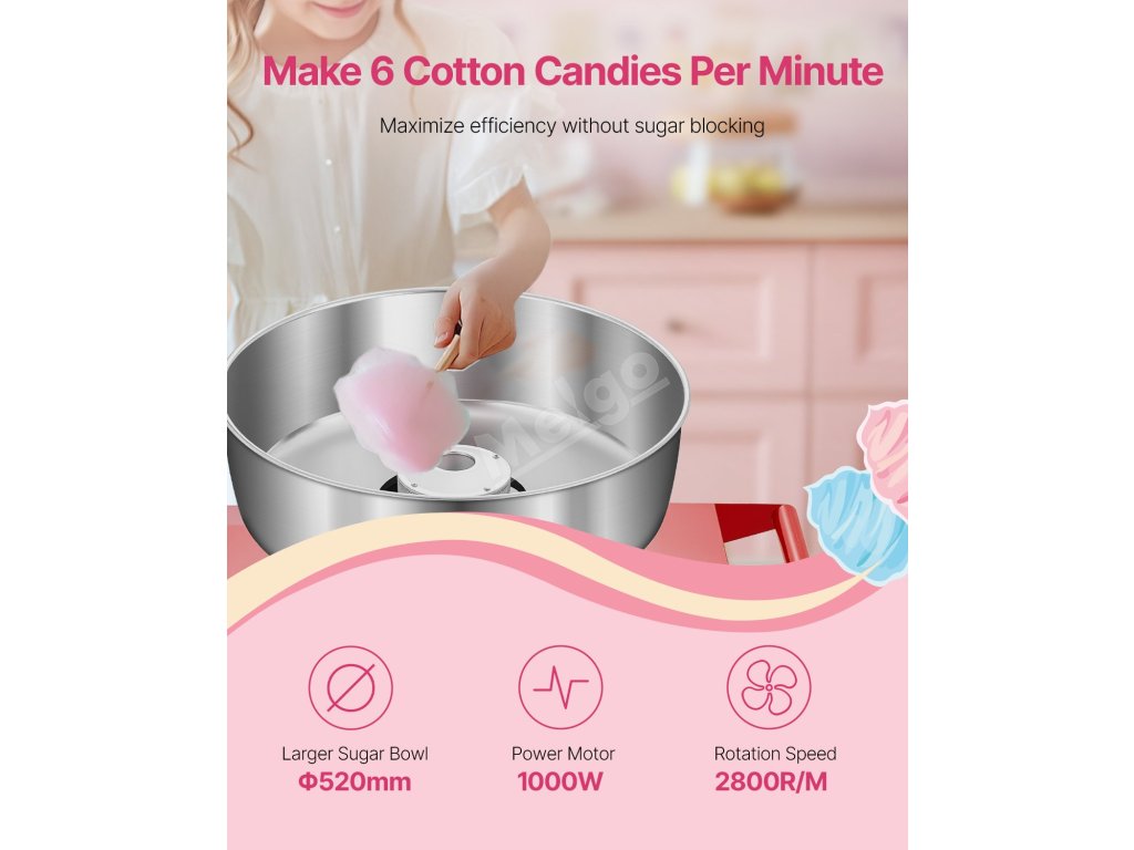 Tento strojek na cukrovou vatu má 1000W motor a větší nádobu na cukrovou vatu, která poskytuje maximálně 6 cukrových vat za minutu. Díky tomuto stroji je výroba cukrové vaty efektivnější a bez námahy.