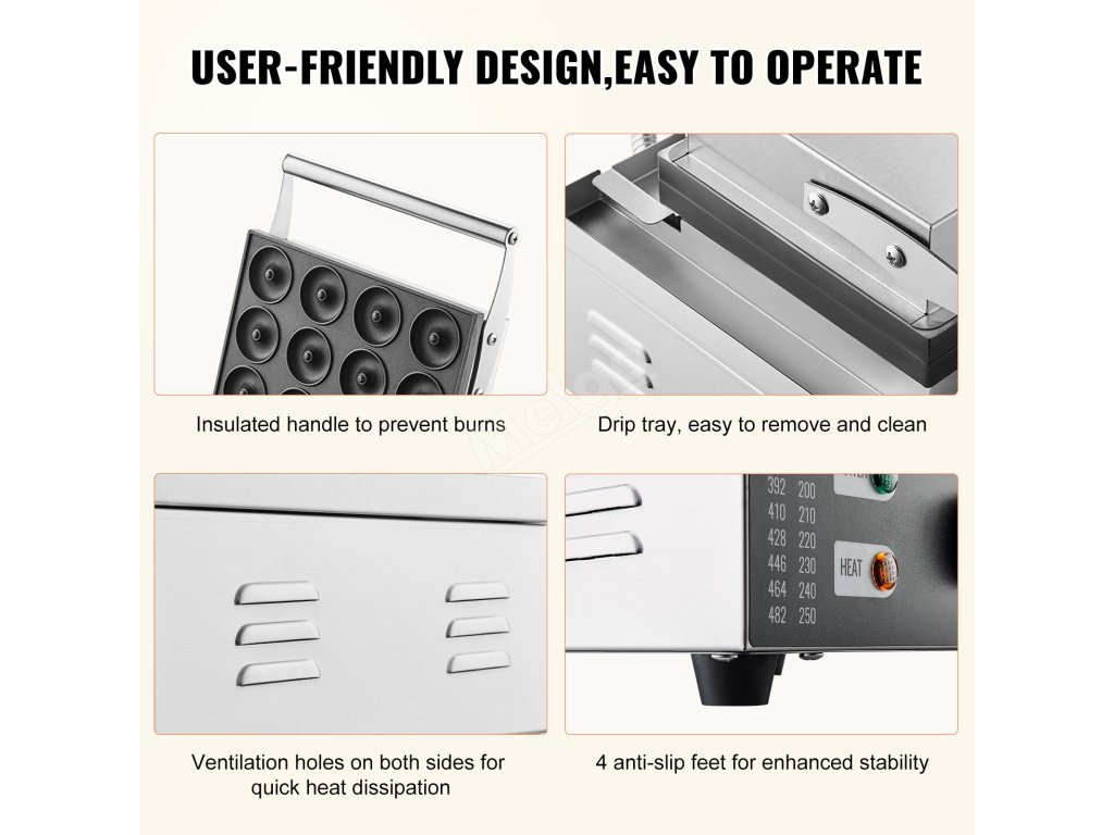 Súčasťou elektrického prístroja na prípravu šišiek je žiaruvzdorná rukoväť z nehrdzavejúcej ocele, ktorá zabraňuje popáleniu. Odkvapkávacia miska je ľahko vyberateľná na pohodlné čistenie. Bočné vetracie otvory zlepšujú chladenie pre efektívnu prevádzku stroja. Protišmykové nožičky zaisťujú stabilitu a prístupnosť prístroja na výrobu donutov.