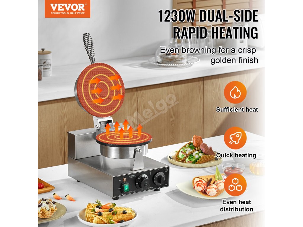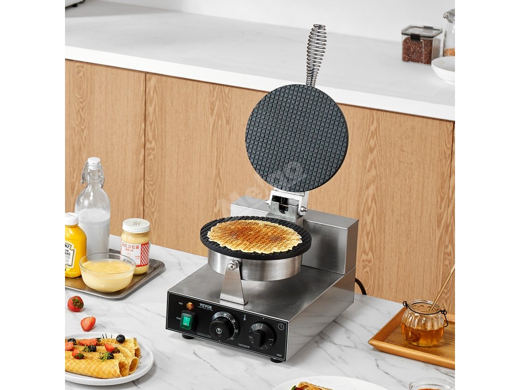 Tento stroj na vaflové kornúty môžete použiť na prípravu lahodných vaflových dezertov pre svoj obchod s dezertmi, ktoré uspokoja každého pri raňajkách alebo popoludňajšom čaji. Vďaka svojmu jedinečnému panelovému dizajnu vyniká, takže je najlepšou voľbou pre váš stánok s občerstvením.