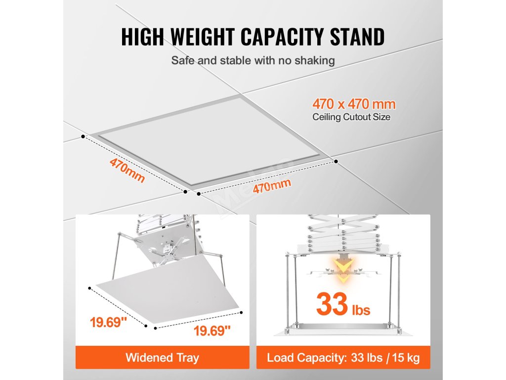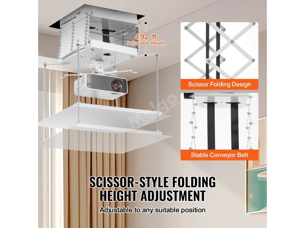 Elektrický zvedák projektoru má konstrukci se střižnou konzolou, odolný dopravní pás a odolné materiály, které umožňují plynulý motorický pohyb s přesným polohováním.