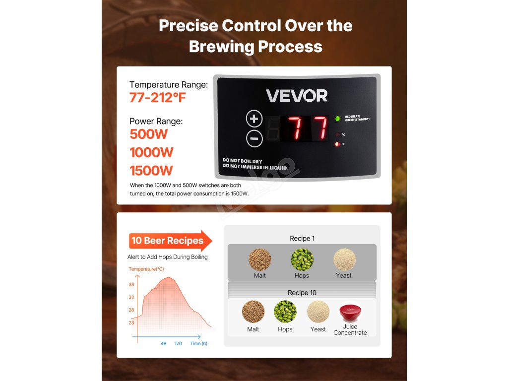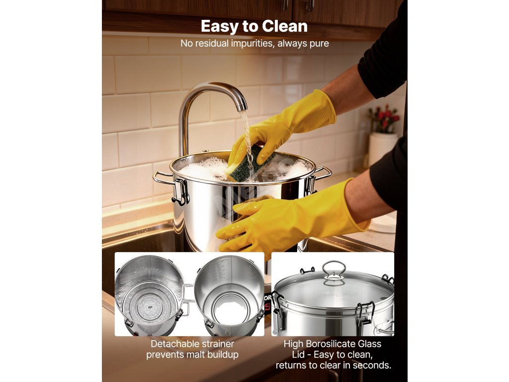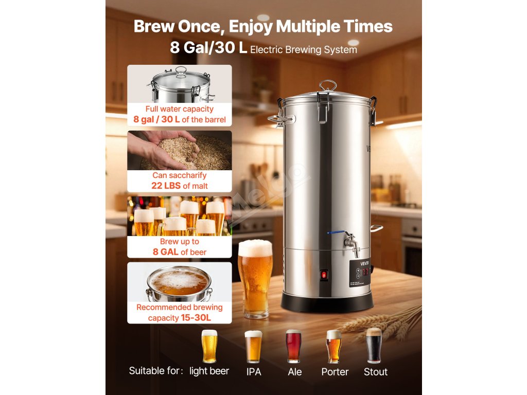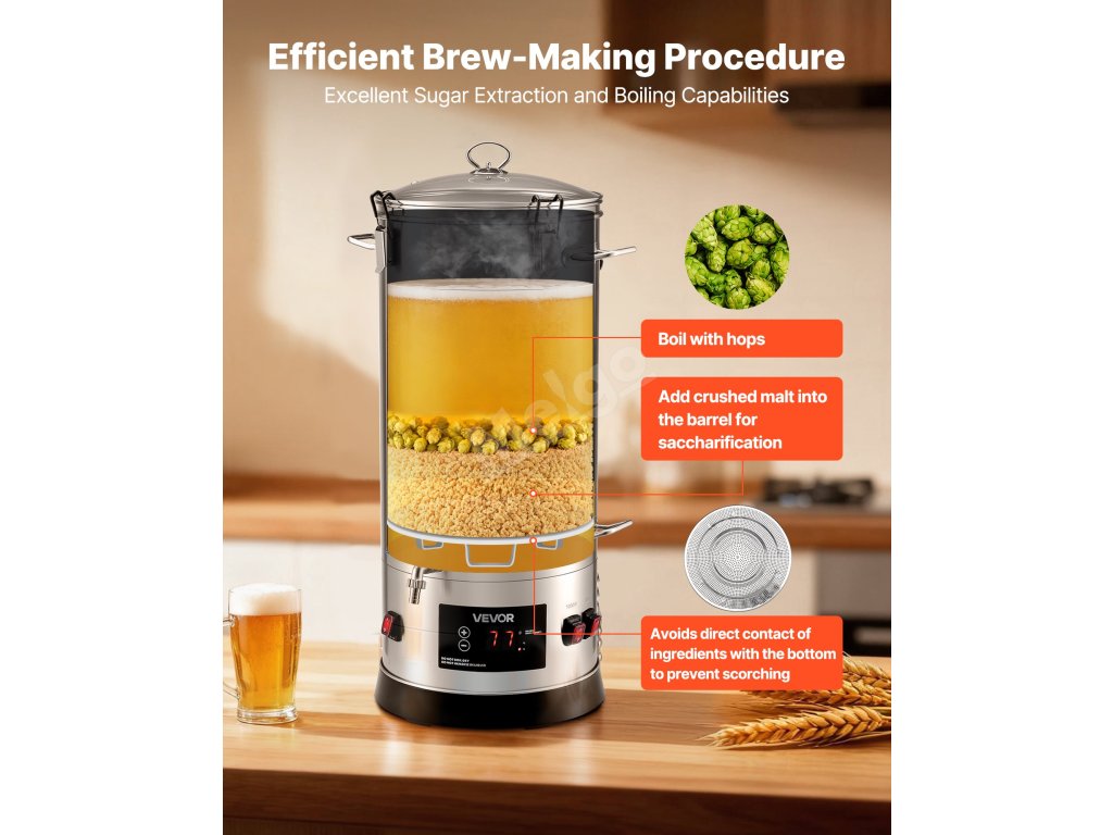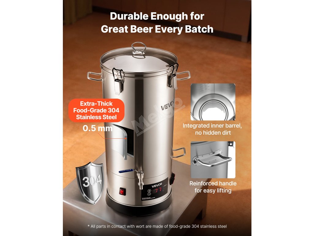 Tento hrnec na vaření piva je vyroben ze zesílené nerezové oceli 304 a zaručuje odolnost a spolehlivost. Hrnec nabízí přesnou regulaci teploty, snadné ovládání a velkou kapacitu pro vaření více druhů piva a splňuje tak potřeby domácího i komerčního vaření piva v malých dávkách - pomůže vám vychutnat si skutečnou "pivní svobodu".