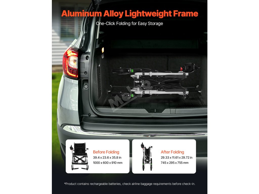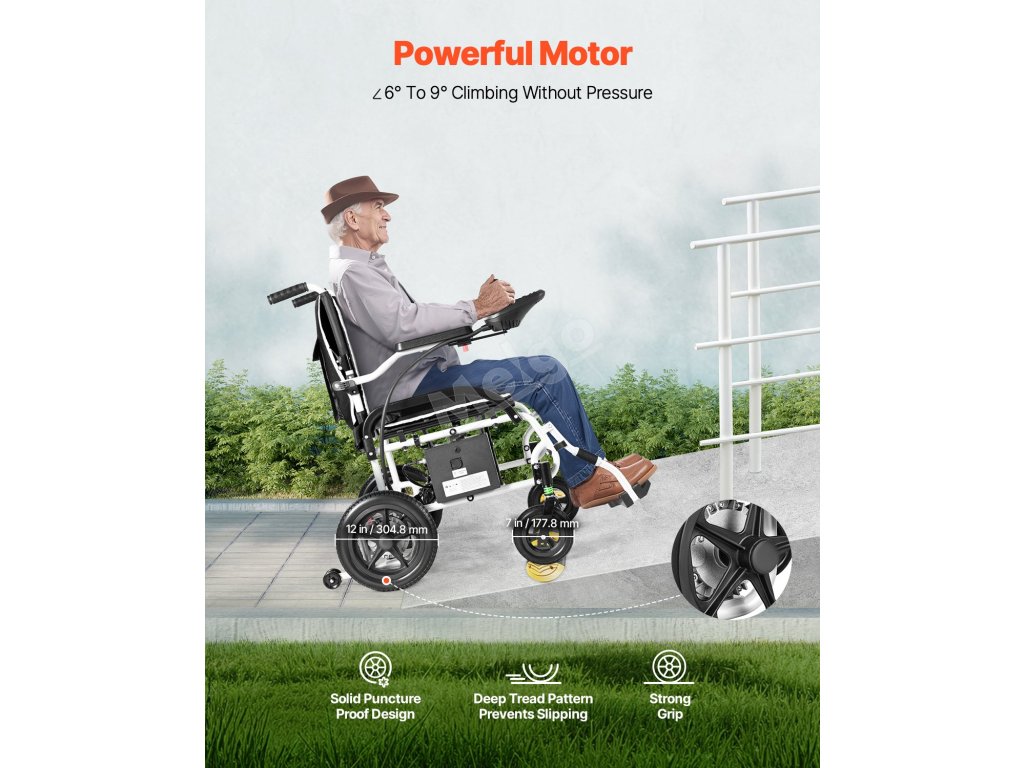 Náš elektrický invalidní vozík má skládací konstrukci pro snadné skladování a pohodlné cestování. Jeho pneumatiky tlumící nárazy a vynikající stoupací schopnosti mu umožňují snadno zvládnout různé terény a zajišťují plynulou jízdu.