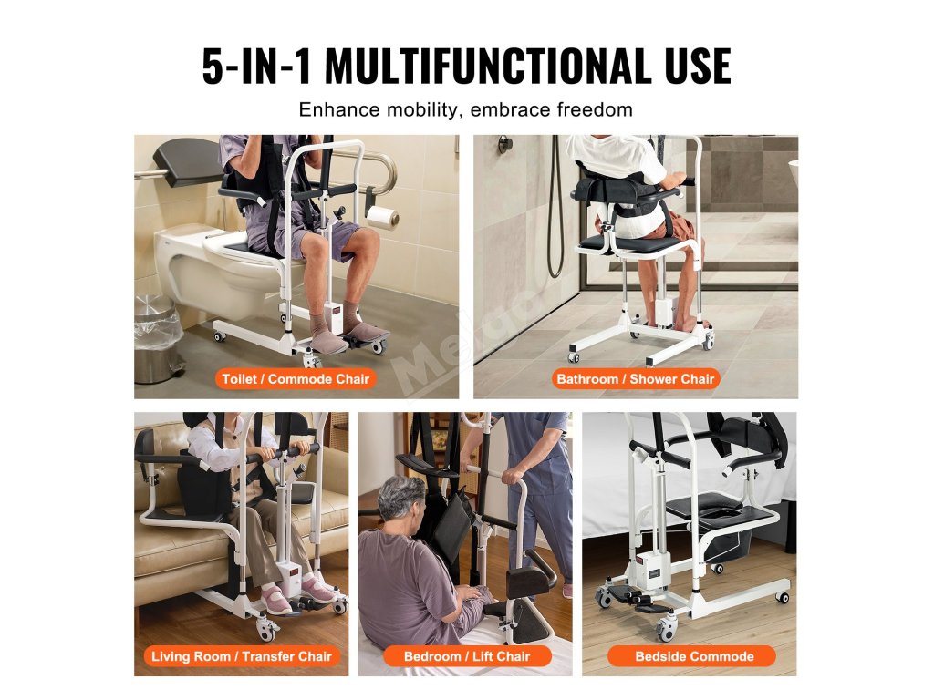 Přepravní křeslo VEVOR 5 v 1 pro seniory se zdravotním postižením kombinuje funkce sprchovacího křesla, komody, přepravního křesla, invalidního vozíku a zvedacího křesla, takže přesuny pacientů jsou plynulejší, bezpečnější a rychlejší. Ať už jde o přesun z lůžka na židli nebo do auta, bez problémů splňuje různé potřeby péče.