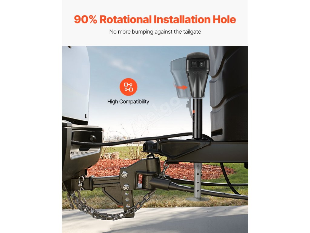Díky vylepšenému otočnému montážnímu otvoru elektrický zvedák přívěsu nepřekáží v zadních dveřích. Vhodný pro přívěsy pro obytné automobily, přívěsy pro koně, užitkové přívěsy a další.