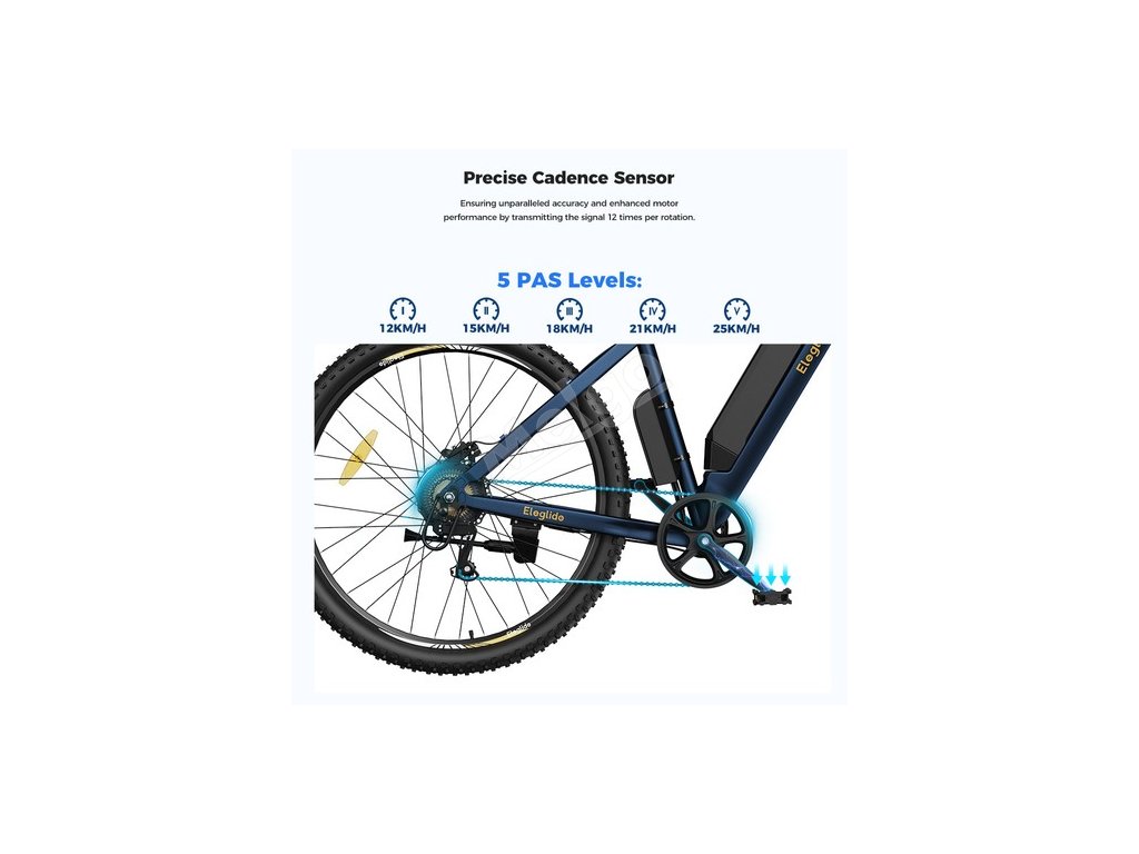 Toto elektrokolo je vybaveno předními a zadními světlomety s certifikací EU StVZO, které zajišťují vynikající viditelnost a bezpečnost za zhoršených světelných podmínek. Displej LCD poskytuje jasné a snadno čitelné informace, abyste byli neustále informováni o své jízdě. Kromě toho můžete kolo ovládat pomocí aplikace Eleglide ve svém telefonu. Tato chytrá aplikace umožňuje aktivovat další funkce, jako je uzamčení kola, nastavení hesla a nastavení časového limitu na displeji, které vám pomohou maximálně využít vaši jízdu.