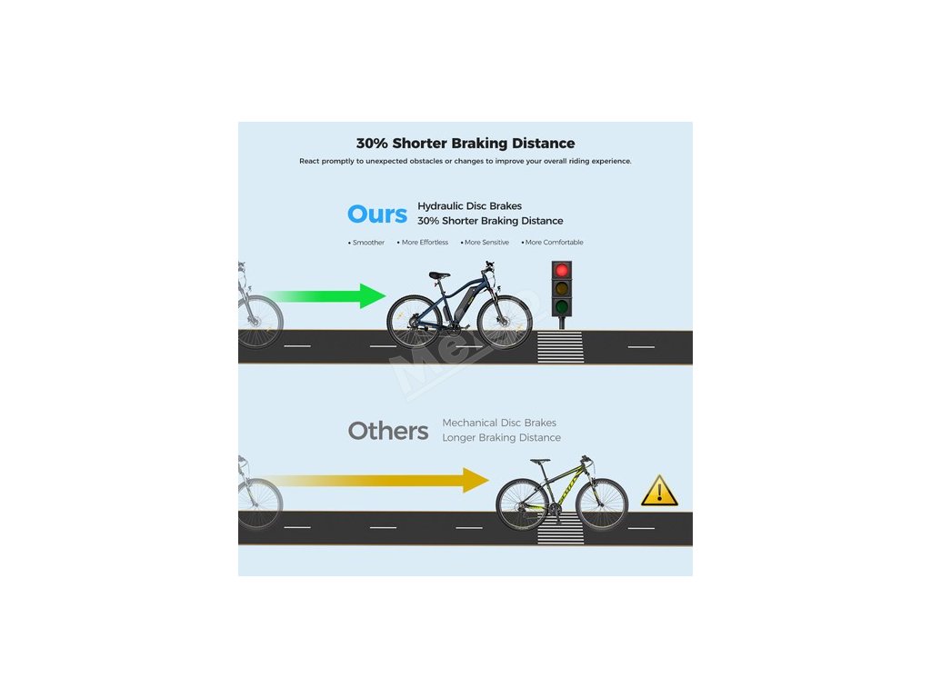 Mopride 3 je vybaven hydraulickými kotoučovými brzdami, které poskytují silný a stabilní brzdný účinek, což vede k hladkému a účinnému zastavení. Brzdná dráha je o 30 % kratší než u mechanických kotoučových brzd, takže jízda v terénu je bezpečnější a spolehlivější.