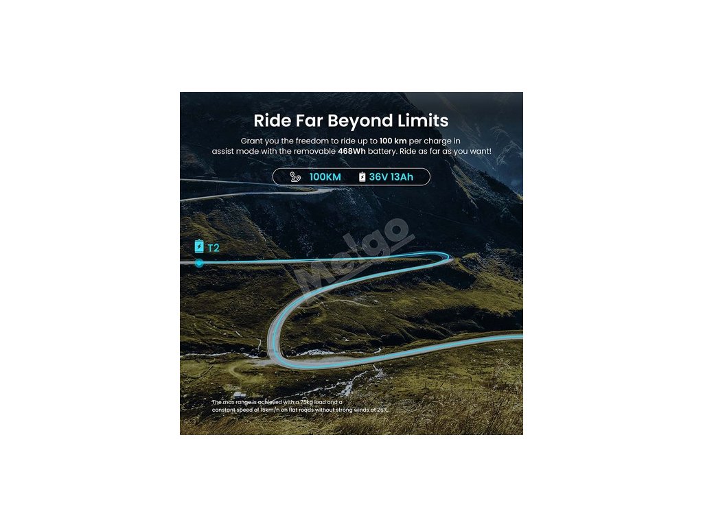 Díky vyměnitelné 486Wh (36V 13Ah) lithium-iontové baterii dokáže elektrokolo T2 na jedno nabití v asistenčním režimu snadno ujet 100 km (62 mil), takže můžete jezdit, jak daleko chcete, bez obav o dojezd. Vložený design je estetičtější a lépe chrání baterii před stříkající vodou. Jeho výkonný bezkartáčový motor poskytuje točivý moment 45 Nm, maximální okamžitý výkon 450 W a maximální rychlost 25 km/h, takže stoupání a zrychlování je hračka. Díky přesnému snímači kadence vysílají pedály signály 12krát za kolo pro přesnou asistenci výkonu bez zpoždění, což umožňuje jízdu bez námahy.