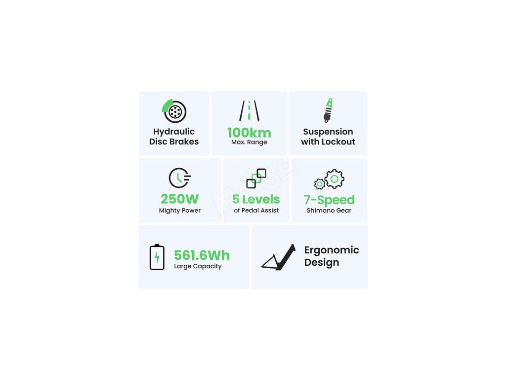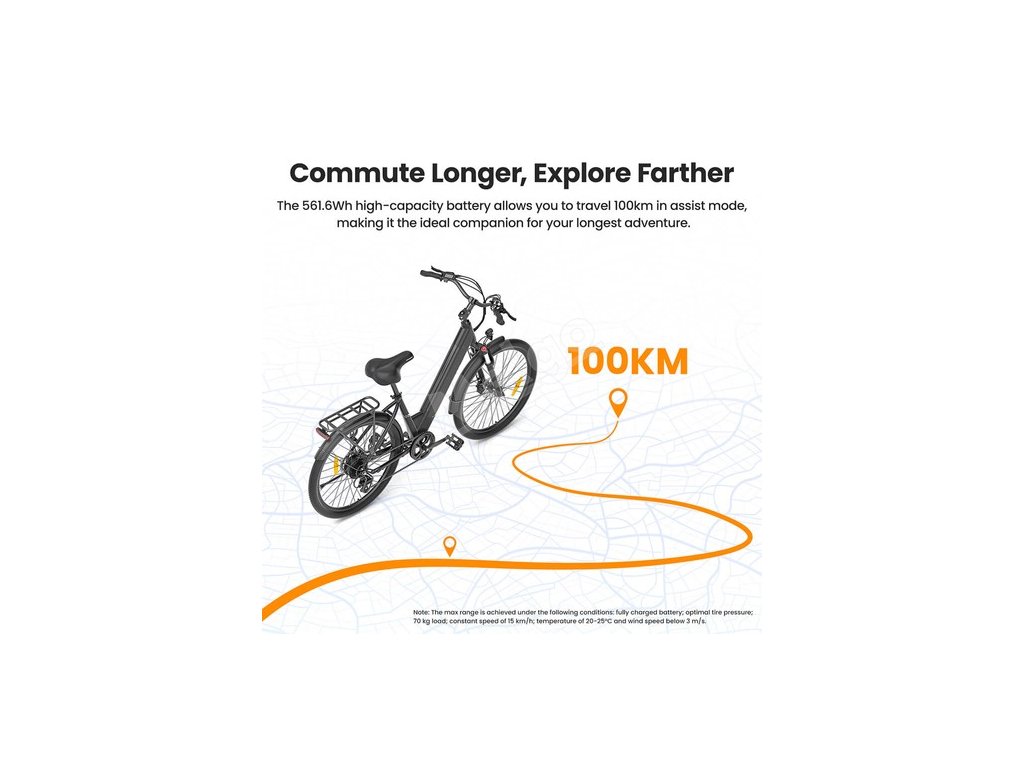 Toto elektrokolo je vybaveno vysokokapacitní baterií 36 V 15,6 Ah (561,6 Wh), která nabízí působivý dojezd více než 100 km na jedno nabití, takže je ideální pro delší dojíždění. Odnímatelná konstrukce baterie zjednodušuje proces nabíjení a nabízí lepší ochranu před kapkami vody a prachem. Pro ty, kteří touží po ještě větším dobrodružství, lze dokoupit další baterii, která prodlouží dojezd a umožní vám neomezené objevování.