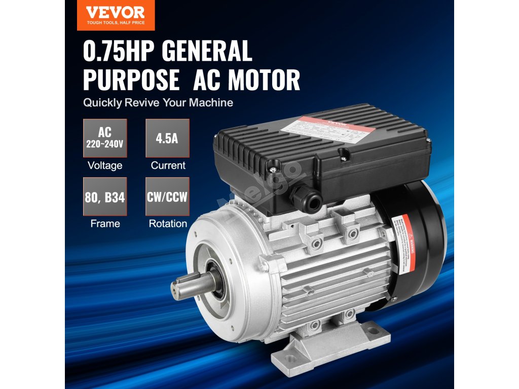 Dodejte svému zařízení silný výkon pomocí elektromotoru VEVOR 0,55 kW. Pracuje při 220~240 V AC s proudem 4,5 A, má vysoké otáčky 1400 min-1, 80, rám B34, délku hřídele 40 mm, hřídel s drážkou 19 mm a duální směr otáčení CW/CCW.