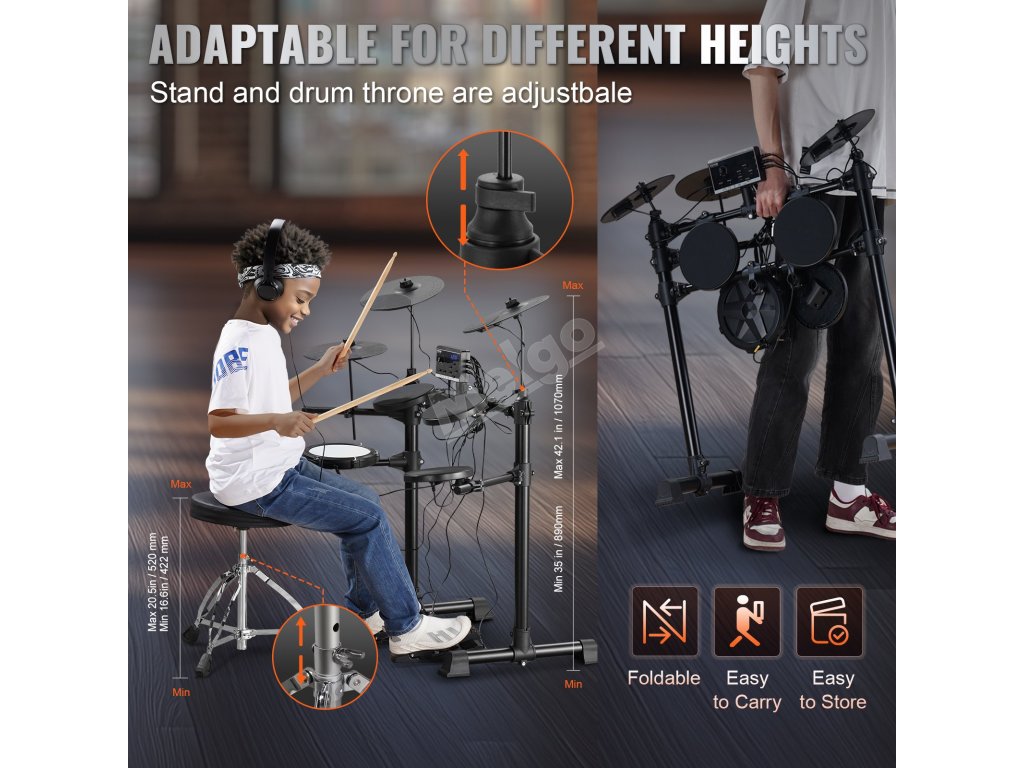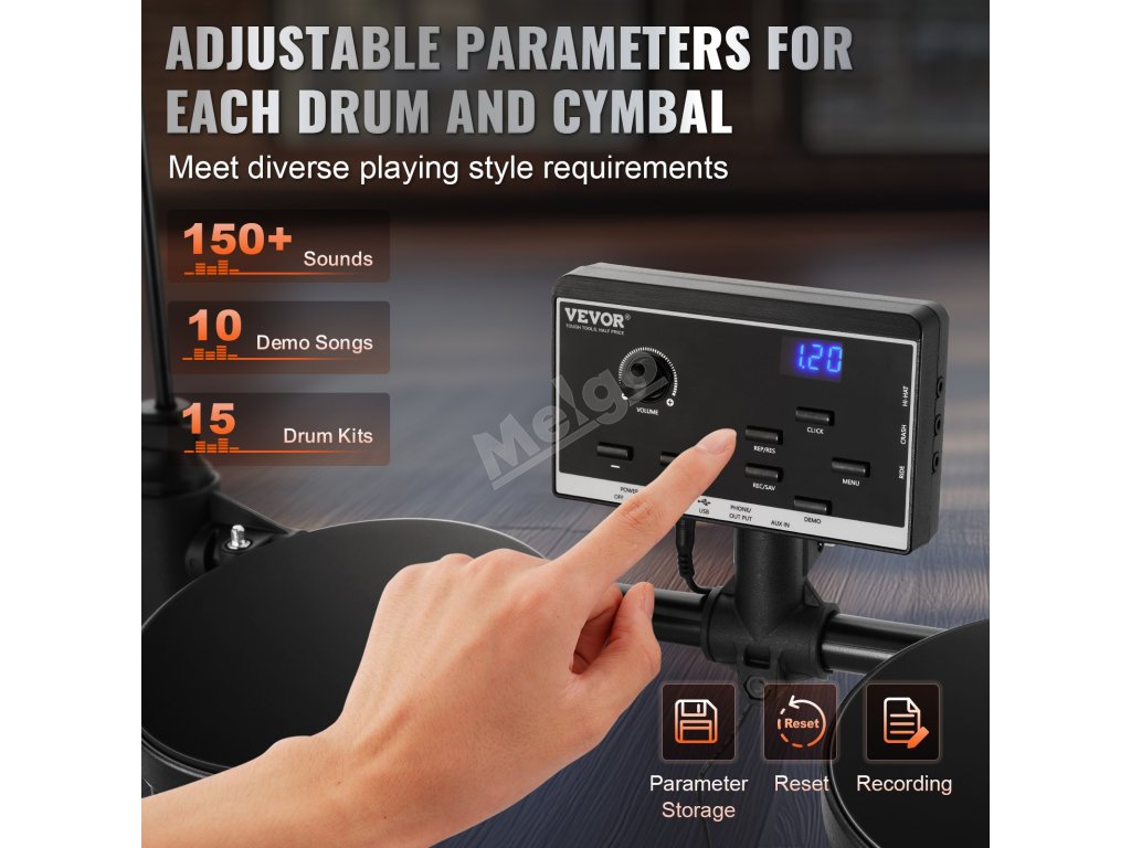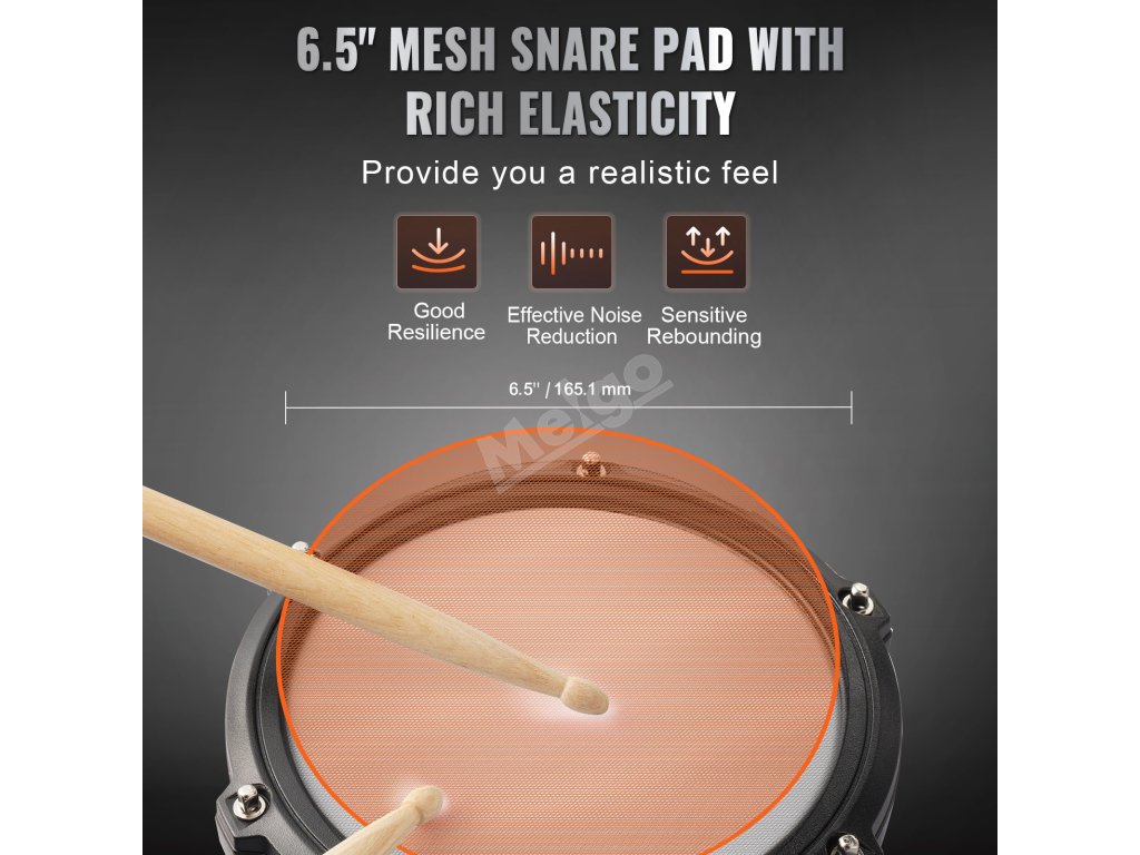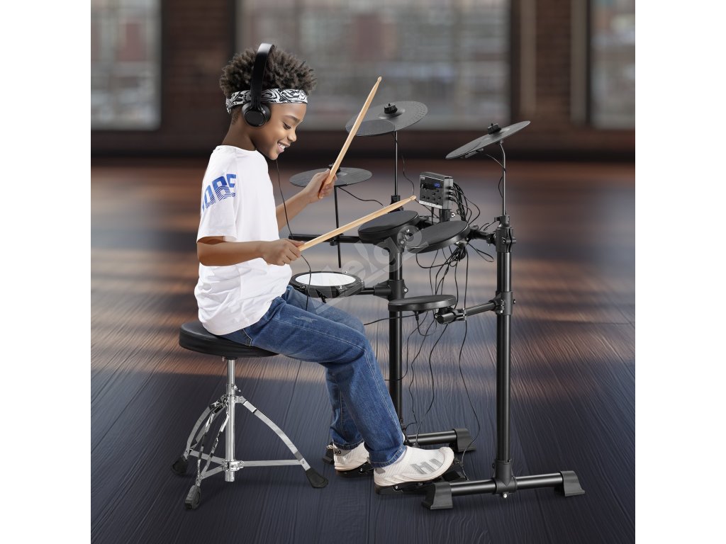 Naše elektrická bicí souprava obsahuje více než 150 zvuků pro různé styly. Díky podpoře MIDI je nahrávání a skládání hračkou. Pociťte realismus s naším 6,5palcovým / 165,1mm snare padem. Nastavitelné trůny a stojany zajišťují pohodlné hraní, ideální pro začátečníky i profesionály!