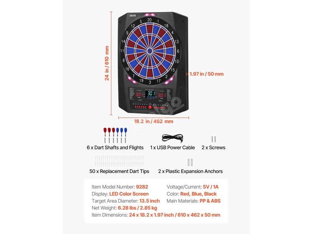 Obsahuje 6 šipkových hřídelí a letek, 50 náhradních šipkových hrotů, 1 napájecí kabel USB, 2 plastové rozšiřující kotvy, 2 šrouby a návod. Není potřeba žádné profesionální nářadí - instalace zabere několik minut a můžete začít okamžitě hrát.