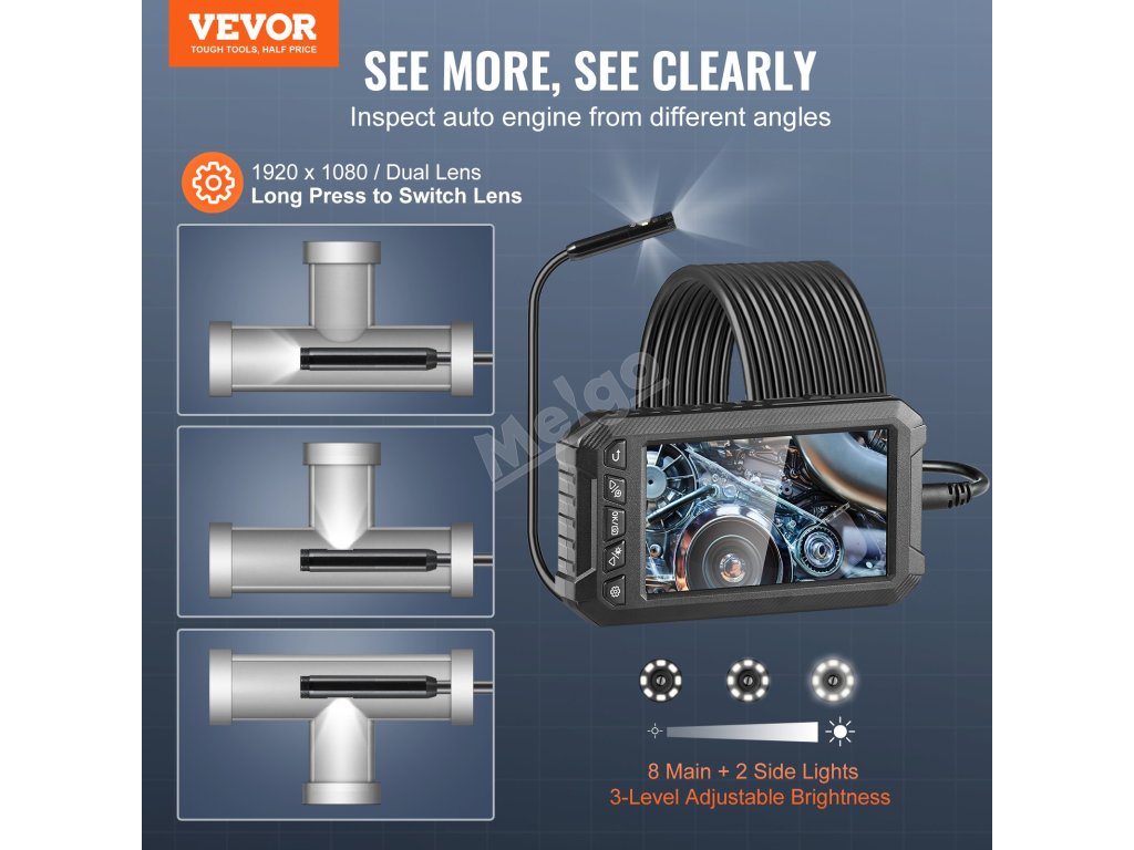 Kamera boreskopu má 8+2 světla se třemi nastavitelnými úrovněmi jasu, které poskytují dostatek světla v tmavých situacích. Nabízí větší zorné pole, kontrolu v reálném čase v rozlišení HD a ostřejší obraz, který se skvěle hodí pro kontrolu vnitřních válců motoru a vodovodního potrubí.