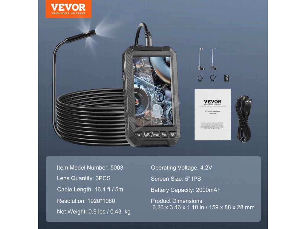 Endoskop VEVOR byl vylepšen o 3 čočky, které vám pomohou získat různé pohledy. Na 5" obrazovce IPS se jasně a živě zobrazují snímky a videa v reálném čase. Pořiďte si tuto dokonalou kameru borescope pro kontrolu motorů automobilů, kontrolu kanalizace, kontrolu vzduchovodů a další.