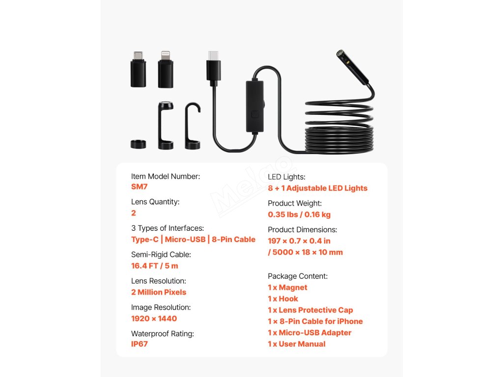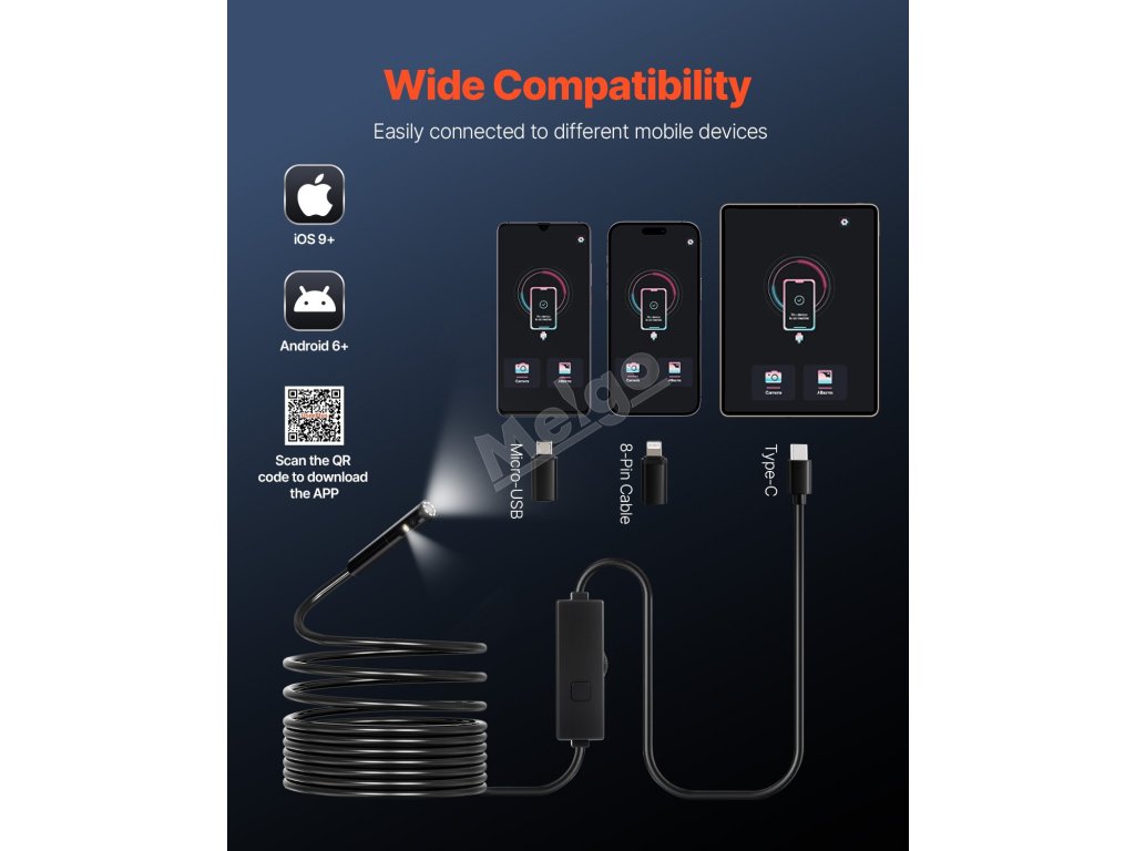 Náš endoskop byl vylepšen o dva objektivy, které vám pomohou získat různé pohledy. Dodává se s 8kolíkovým kabelem, adaptérem Type-C a adaptérem Micro-USB, kompatibilním s iOS 9+ a Android 6+ s podporou OTG, ideálním pro inspekce automobilových motorů, inspekce kanalizačního potrubí, inspekce vzduchotechnických kanálů a další.