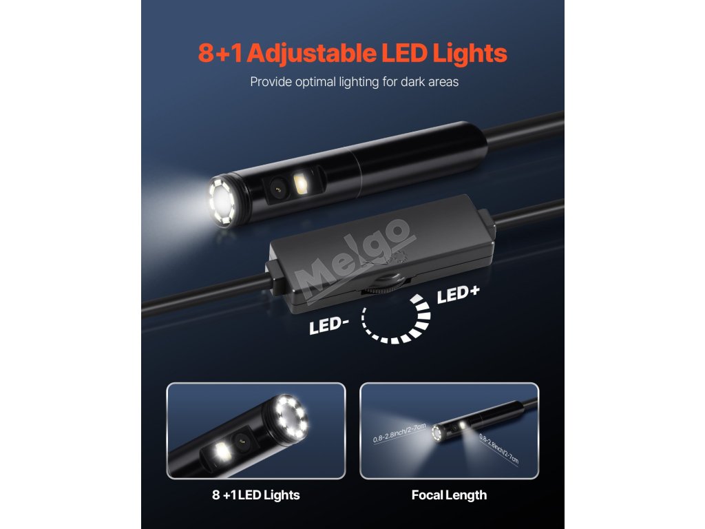 Inspekční kamera pro instalatérské práce je vybavena 8+1 světly LED s nastavitelným jasem, která poskytují dostatek světla v tmavých situacích. 0.optimální ohnisková vzdálenost 8 - 2,8 palce (2 - 7 cm) nabízí velké zorné pole pro jasnou kontrolu, což je skvělé pro kontrolu vnitřního válce motoru a vodovodního potrubí.