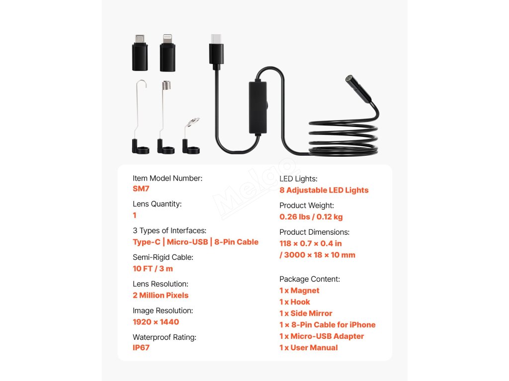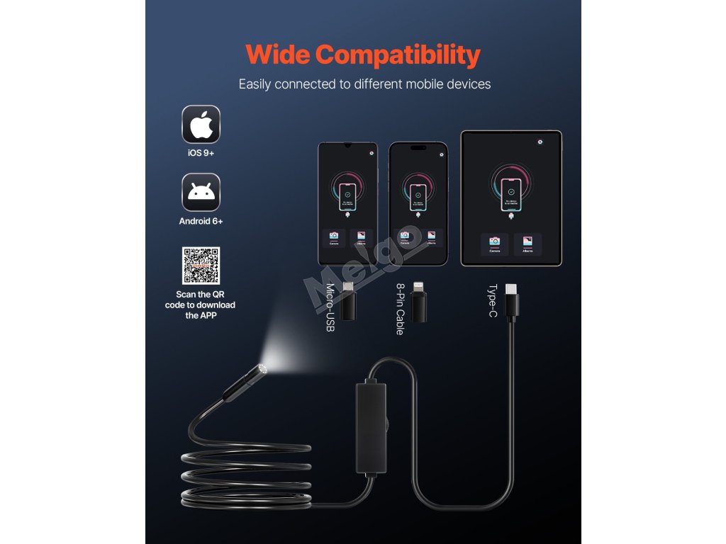 Náš endoskop s 3m polotuhým hadím kabelem je vaším nepostradatelným partnerem pro přesné kontroly. Dodává se s 8kolíkovým kabelem, adaptérem Type-C a adaptérem Micro-USB, kompatibilním se systémy iOS 9+ a Android 6+ s podporou OTG, ideálním pro kontrolu motoru automobilu, kanalizačního potrubí, vzduchotechnického potrubí a dalších.