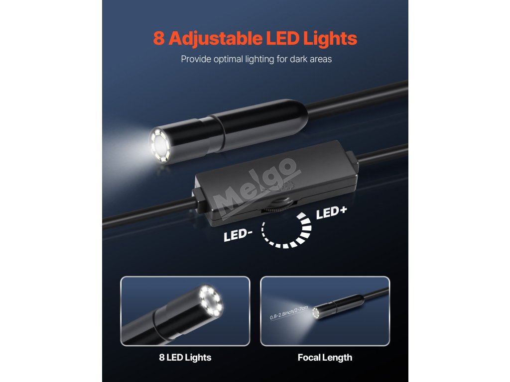 Průmyslová inspekční kamera má 8 světelných diod LED s nastavitelným jasem, které poskytují dostatek světla v tmavých situacích. 0.optimální ohnisková vzdálenost 8 - 2,8 palce (2 - 7 cm) nabízí velké zorné pole pro jasnou kontrolu, což je skvělé pro kontrolu vnitřních válců motoru a vodovodních potrubí.