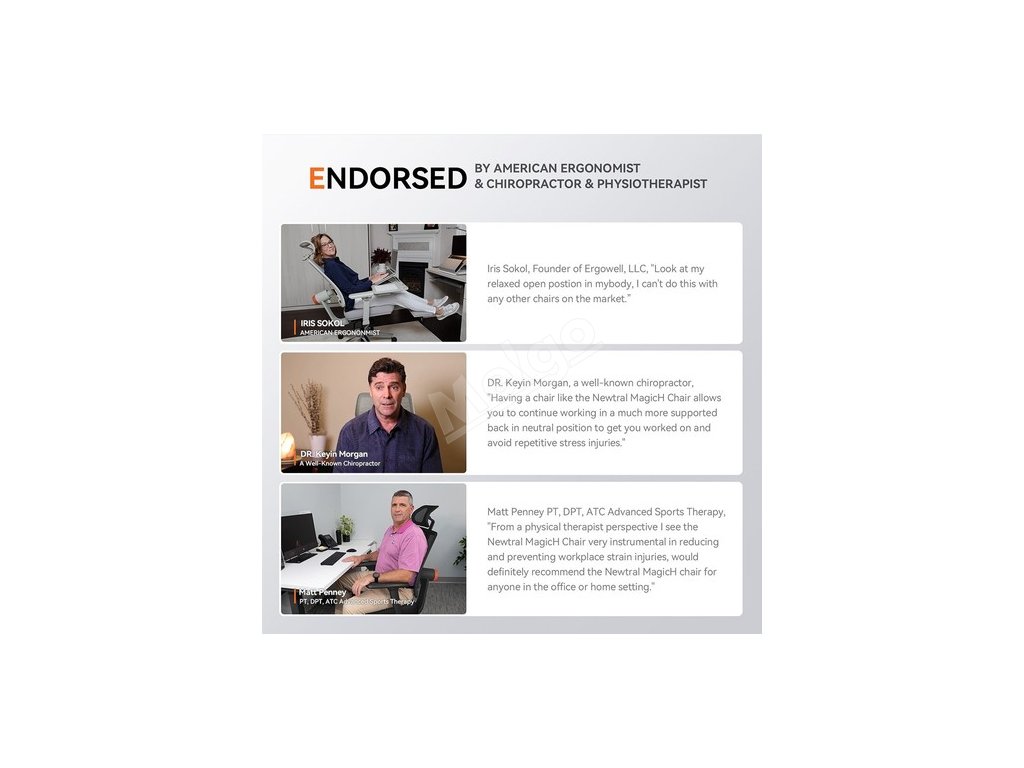 Tuto židli podpořili odborníci, jako je Iris Sokolová, americká ergonomka, Dr. Kevin Morgan, významný chiropraktik, a Matt Penney PT, DPT, ATC z Advanced Sports Therapy. Podporuje uvolněnou, neutrální polohu zad, čímž účinně zmírňuje a předchází zraněním způsobeným nesprávným držením těla, čímž se odlišuje od ostatních židlí.