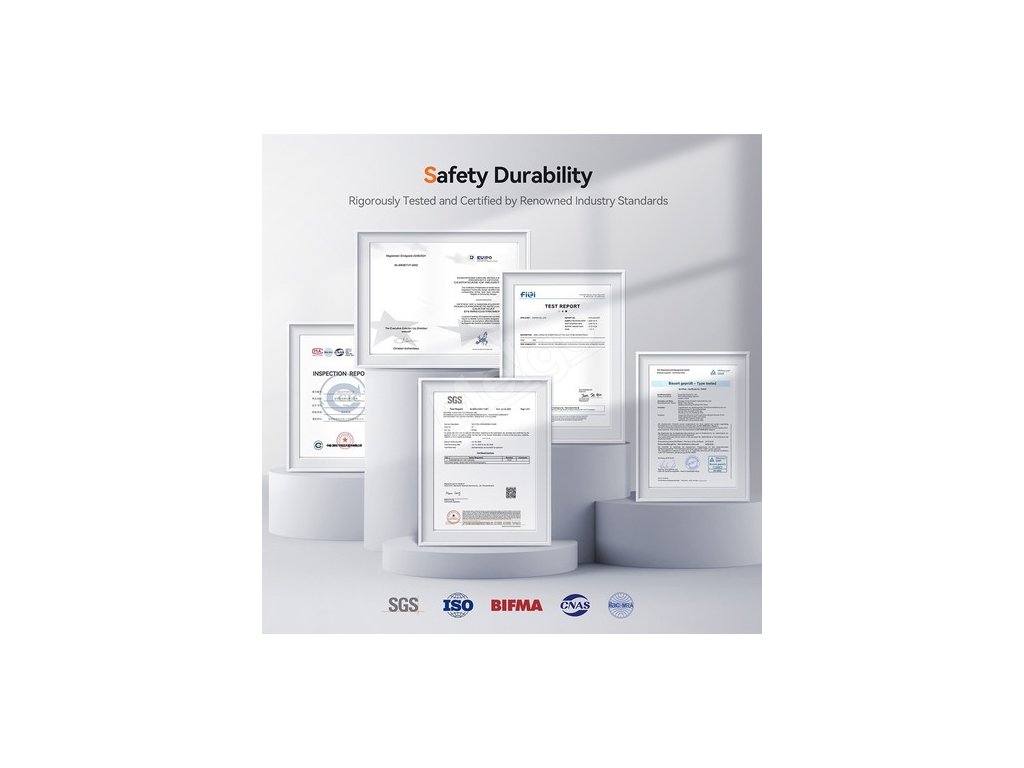 Je vybaven plynovým kladkostrojem třídy 4 s certifikátem SGS a pyšní se certifikáty BIFMA a EN1335, které zaručují jeho odolnost a spolehlivost. Díky srozumitelným návodům a potřebnému nářadí je instalace pro každého bezproblémová.