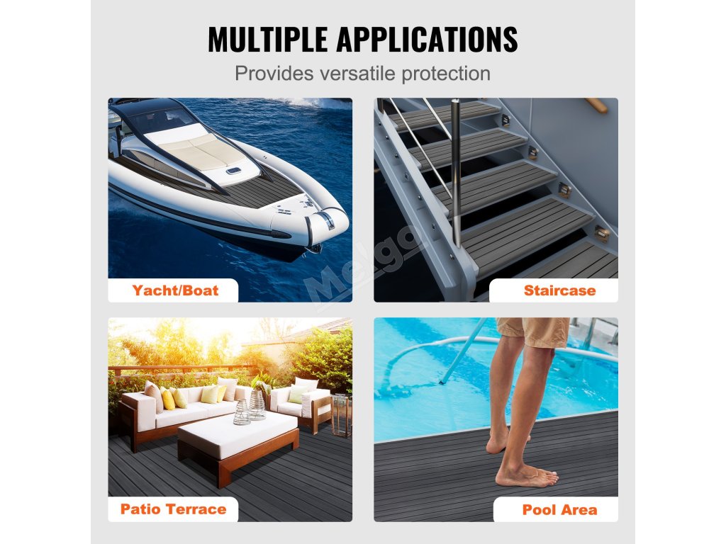 K dispozici jsou čtyři barvy: maskáčová, šedá, tmavě šedá a hnědá. Rozměry pěnové lodní paluby VEVOR od 11,62 m² do 31,02 m² jsou vhodné pro schody, lodě nebo paluby bazénů.