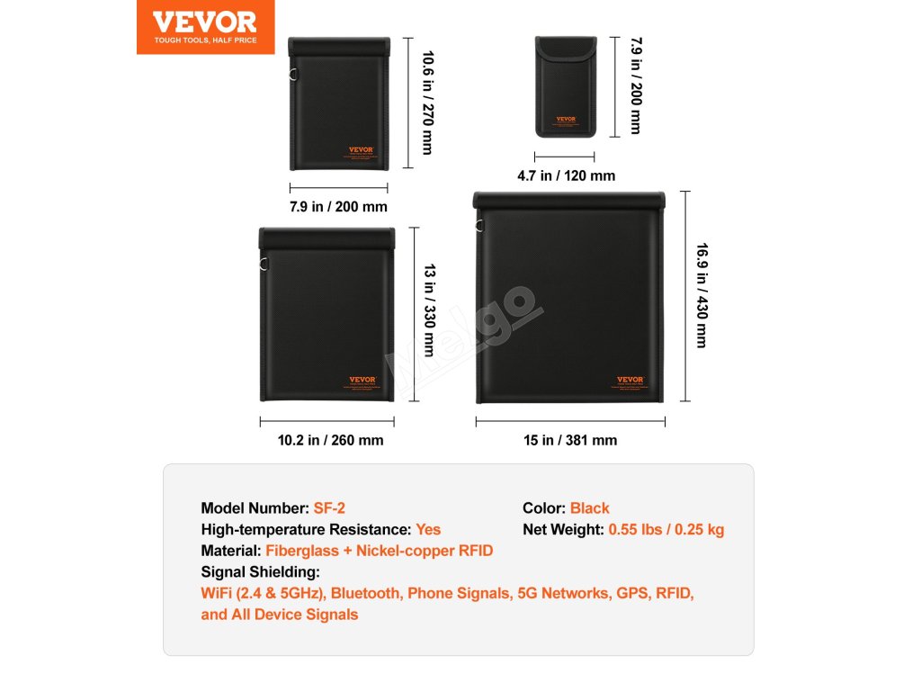 Toto faradayovo pouzdro se dodává v různých velikostech pro flexibilní uložení velkých notebooků, tabletů, mobilních telefonů, karet, hotovosti, dokumentů, vysílaček, jednotek GPS a dalších elektronických zařízení v závislosti na velikosti.