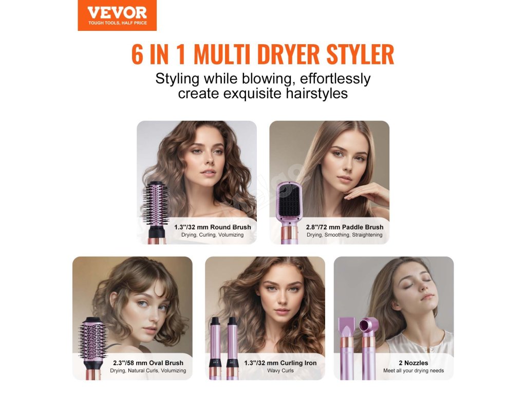 Tepelný kartáč VEVOR 6 v 1 má 2 kulmy, 3 odnímatelné kartáčové hlavy a 2 trysky (kulatý, lopatkový a oválný kartáč, kulatá hlava a koncentrovaná tryska), které vám umožní bez námahy vytvářet úžasné účesy a profesionální stylingové efekty.