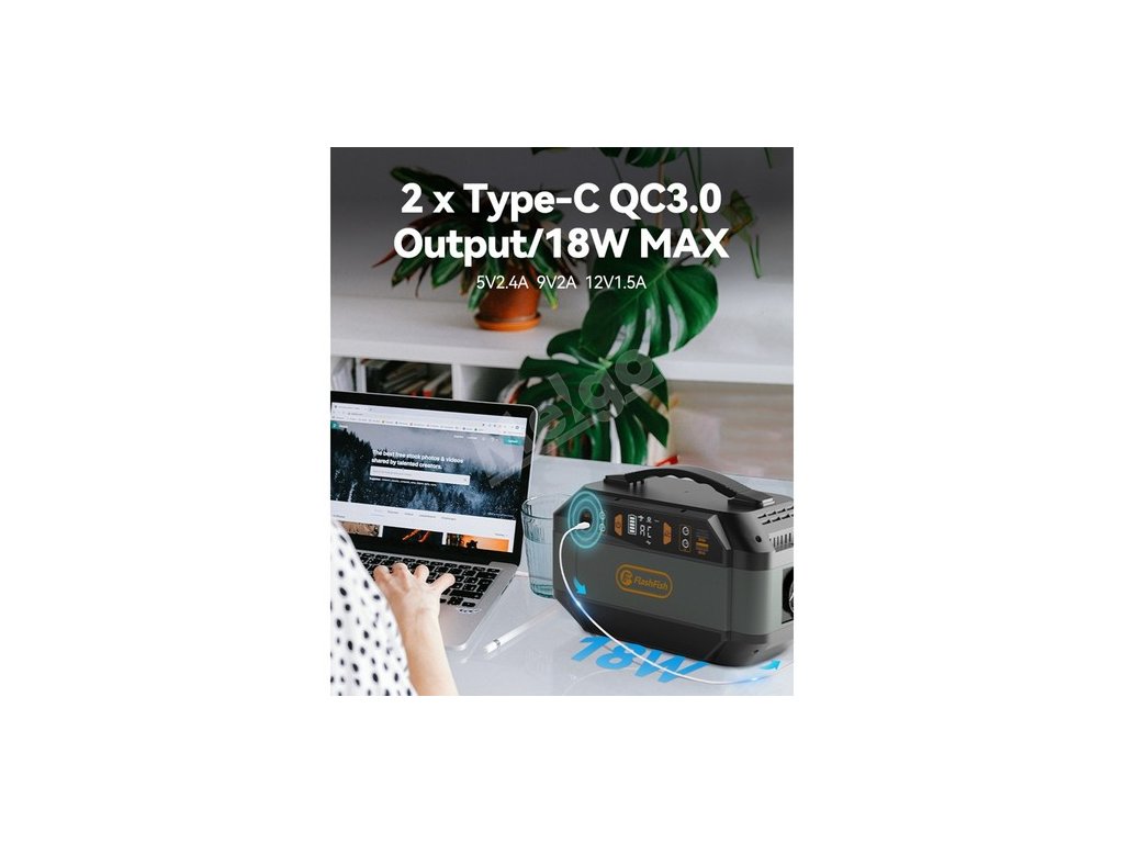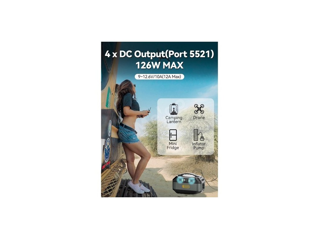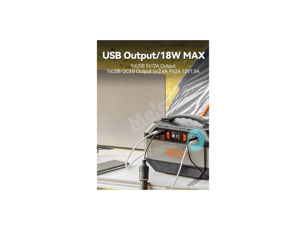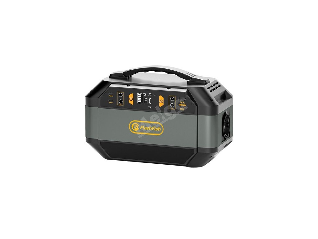 Přenosná napájecí stanice Flashfish P56 je vybavena 1 x zásuvkou střídavého proudu (330 W, 600 W ve špičce), 4 x porty stejnosměrného proudu (max. 12 V/10 A), 2 x portem USB-C, 1 x portem USB QC3.0, 1 x portem USB (5 V/2 A). Může napájet váš smartphone, notebook, fotoaparát, drony, spotřebiče do auta, přístroj CPAP, ledničku, mixér a další.