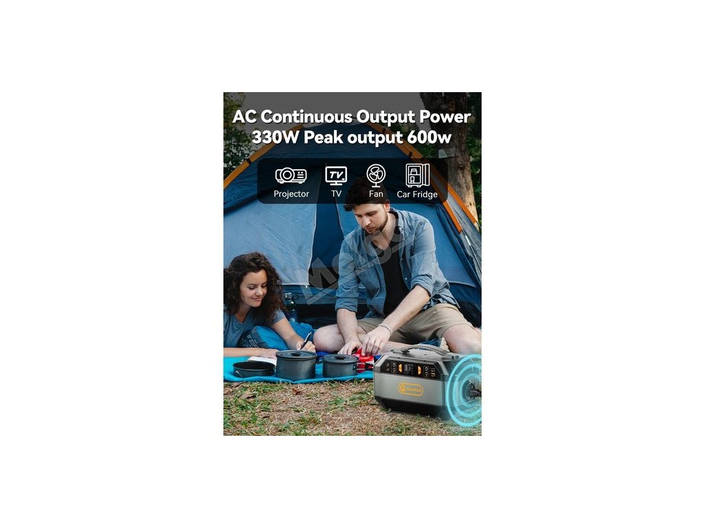 Tato napájecí stanice poskytuje čistý sinusový výstup, což znamená, že její výstup střídavého proudu je stejný jako výstup vašeho domácího střídavého proudu, takže je téměř kompatibilní se všemi zařízeními střídavého proudu ve vaší domácnosti. Tento měnič elektrické energie může nouzově napájet téměř všechny spotřebiče ve vaší domácnosti, které mají příkon nižší než 330 W. Tento výrobek je určen pouze pro nouzové použití a neměl by být používán jako náhrada běžného střídavého napájení vaší domácnosti.