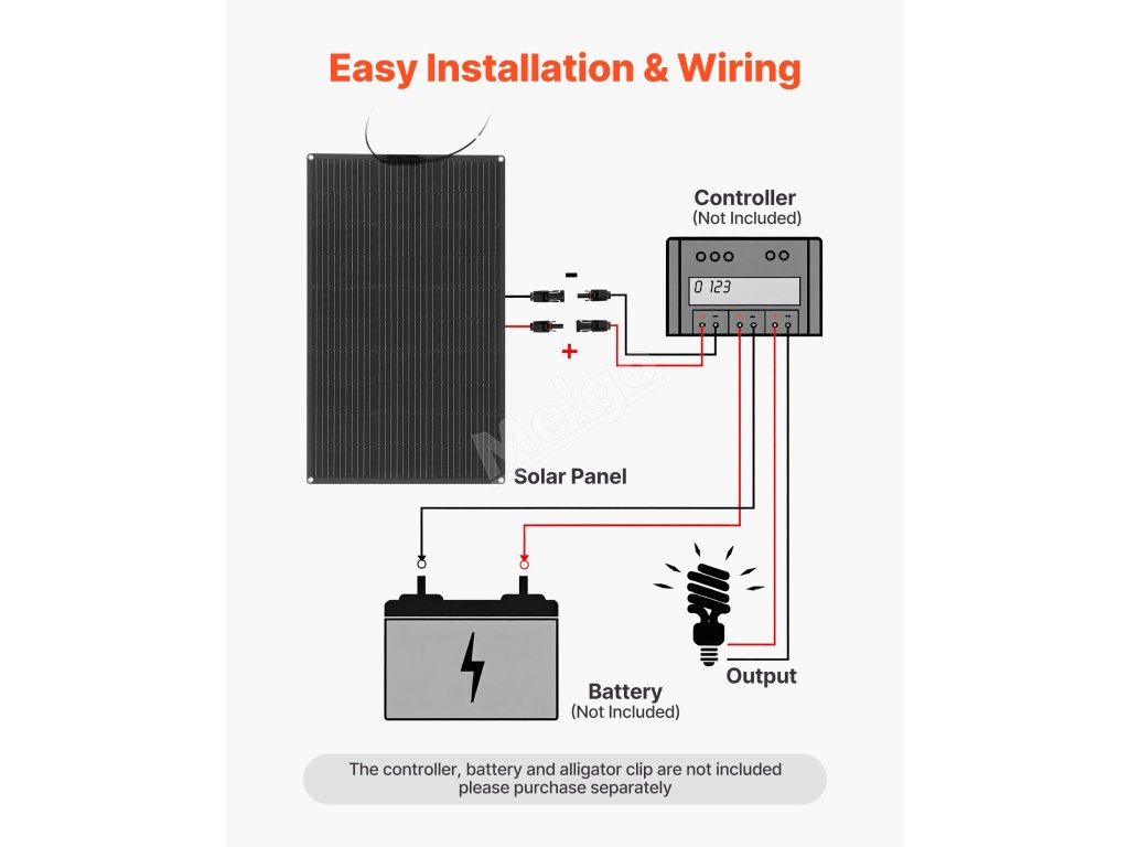 Tato flexibilní mono solární off-grid nabíječka, vybavená vestavěným kabelem MC4, nabízí bezpečné připojení k řídicí jednotce a baterii pro stabilní napájení. (Řídicí jednotka, baterie a krokové svorky nejsou součástí dodávky.)