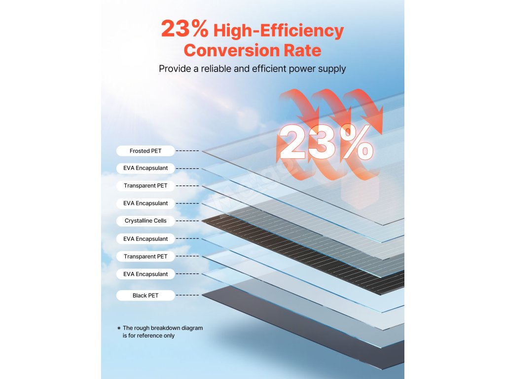 S naším monokrystalickým solárním panelem s vysokou účinností si můžete užívat spolehlivou energii podle potřeby. S účinností přeměny ≥ 23 % poskytuje stabilní a stálý výstupní výkon, který udrží vaše zařízení pod napětím.