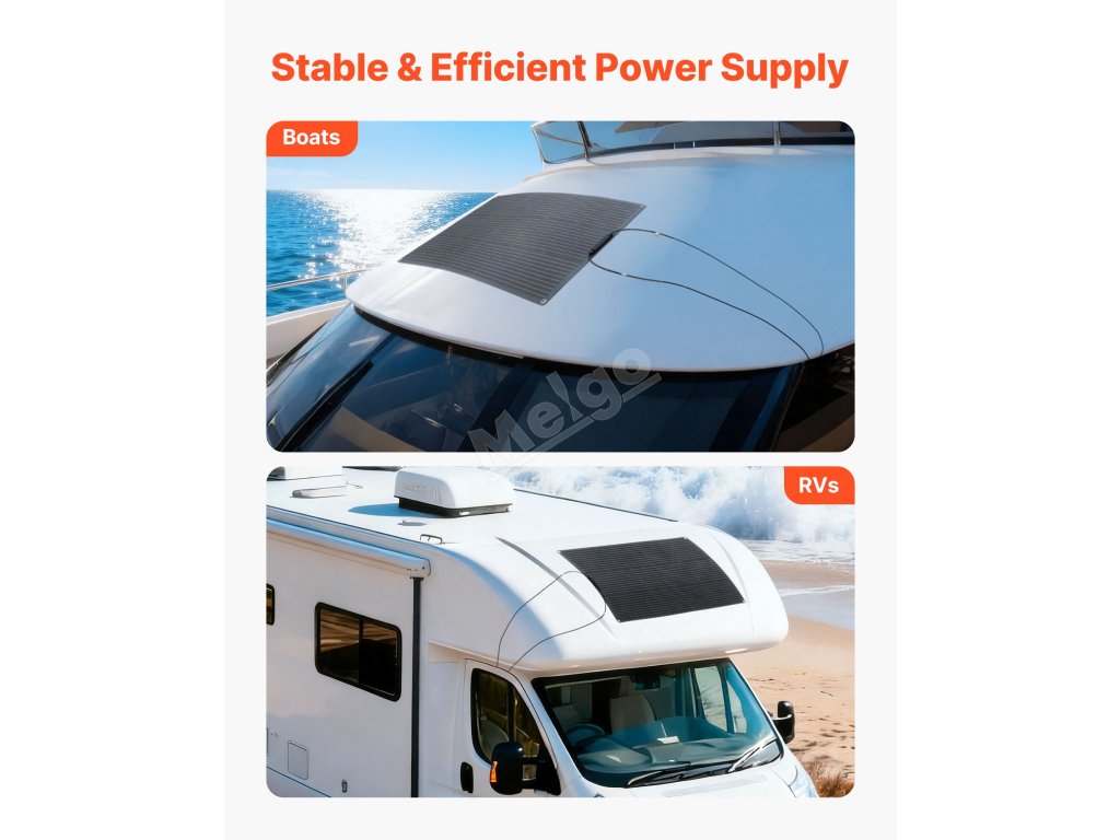 Tento flexibilní solární panel s ohýbatelnou konstrukcí se přizpůsobí zakřiveným a nerovným povrchům, jako jsou střechy karavanů, lodí, domů a chat. Díky tenké a lehké konstrukci se snadno přenáší, montuje a přemisťuje.
