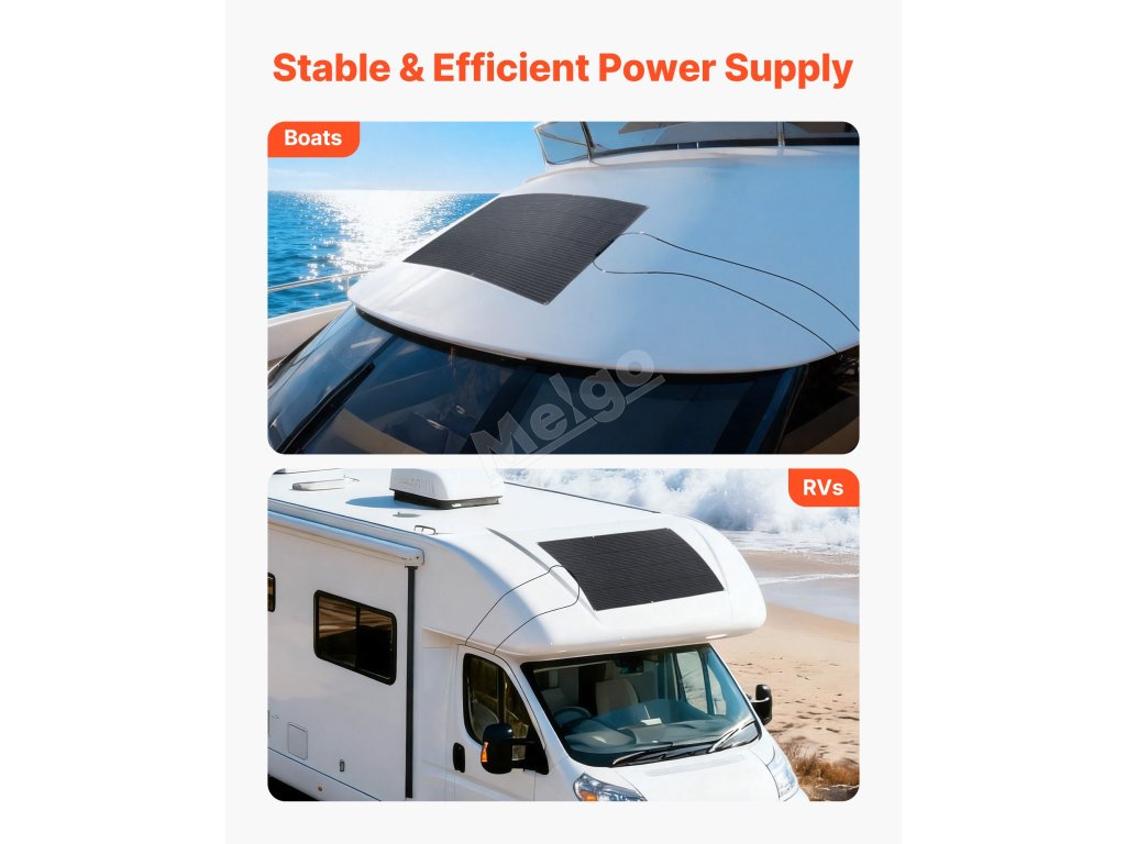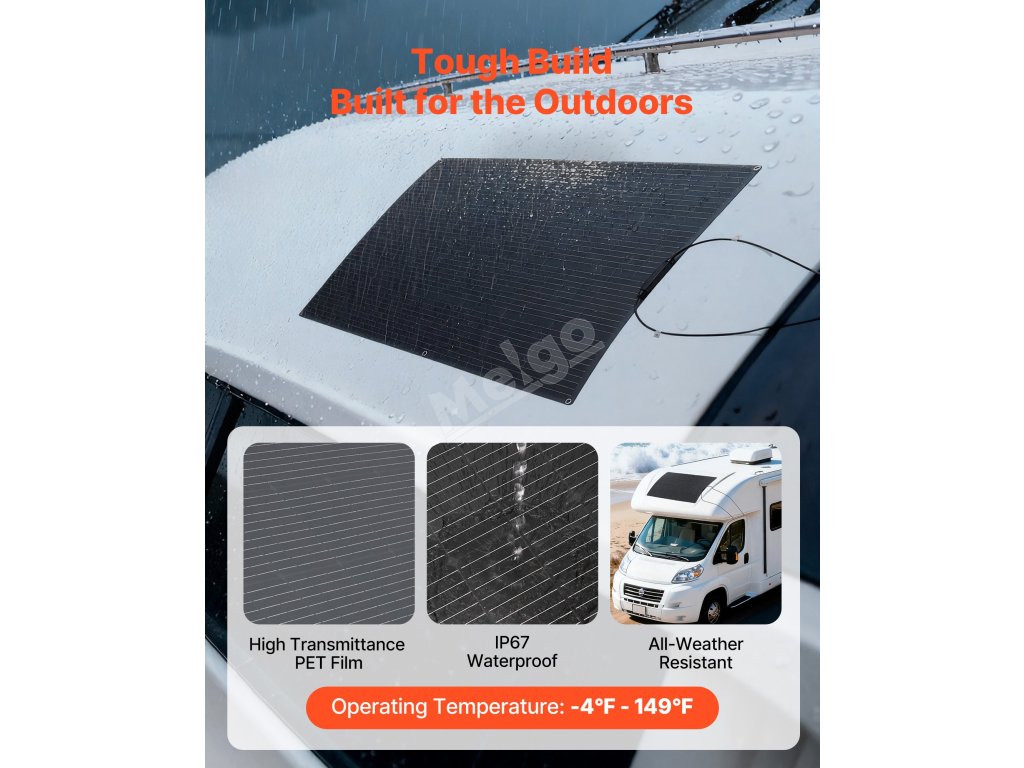 Tento flexibilní solární panel s ohýbatelnou konstrukcí se přizpůsobí zakřiveným a nerovným povrchům, jako jsou střechy karavanů, lodí, domů a chat. Díky tenké a lehké konstrukci se snadno přenáší, montuje a přemisťuje.