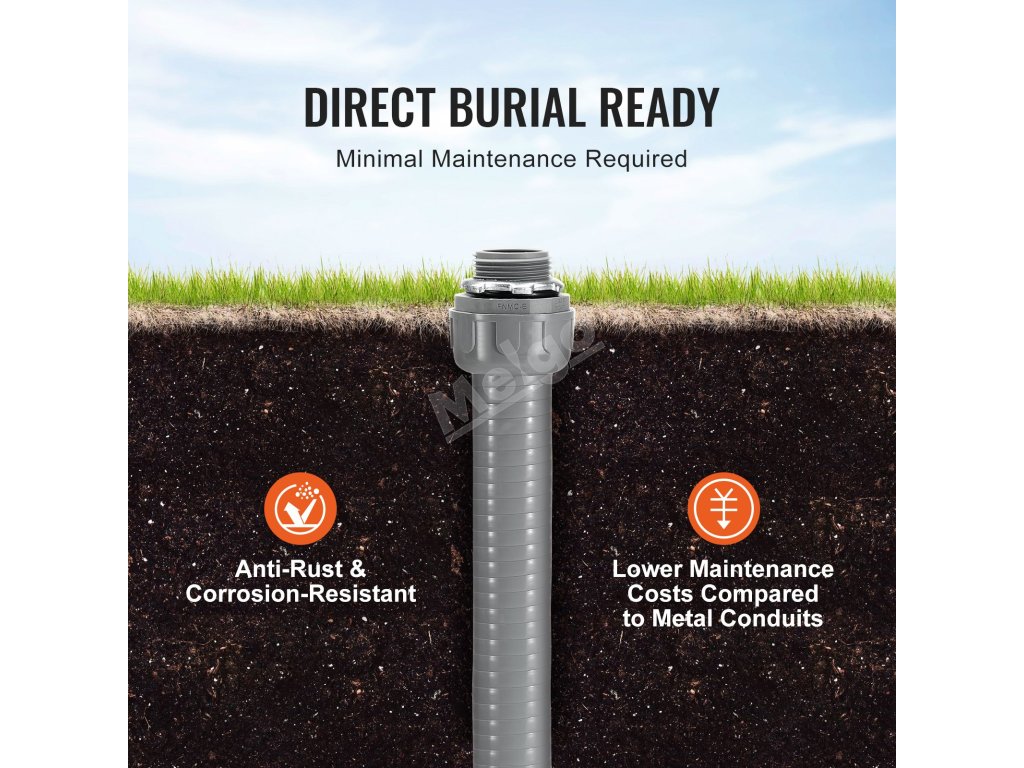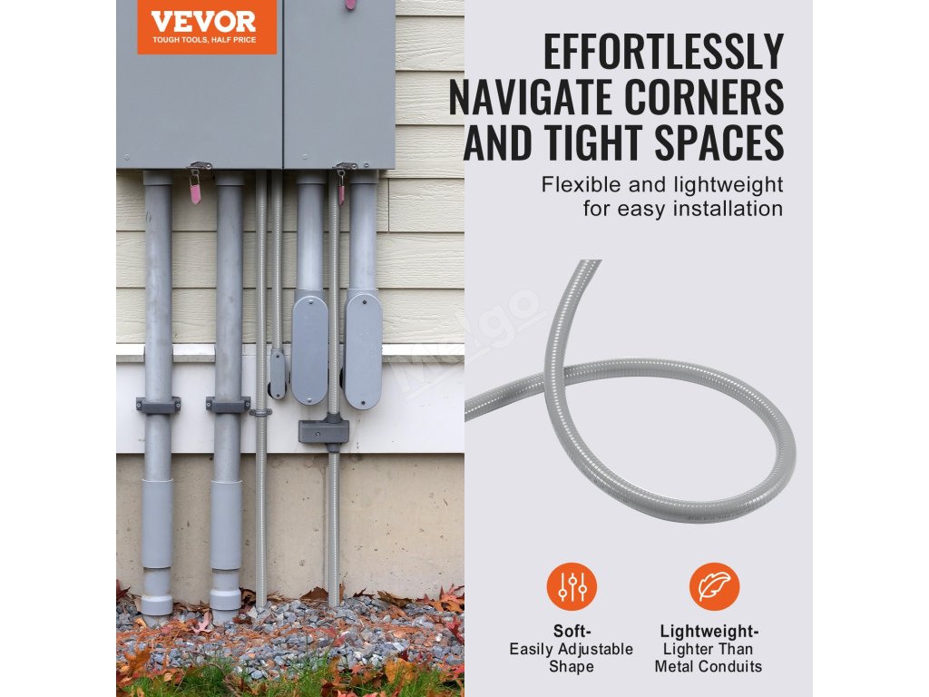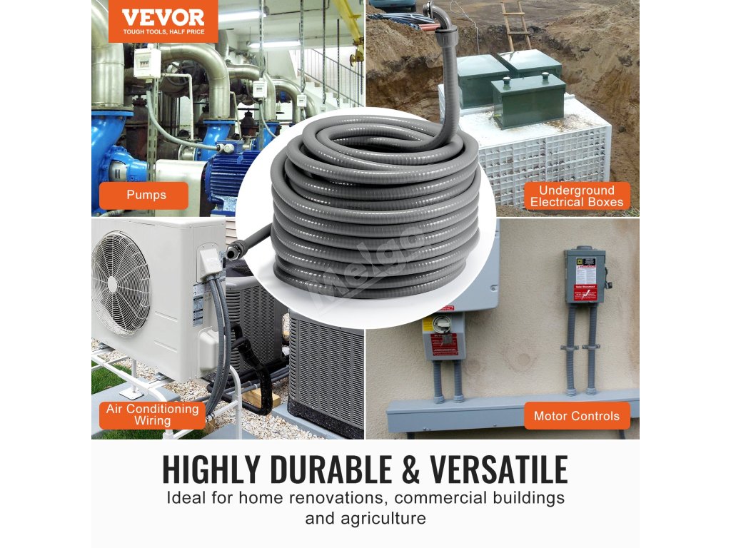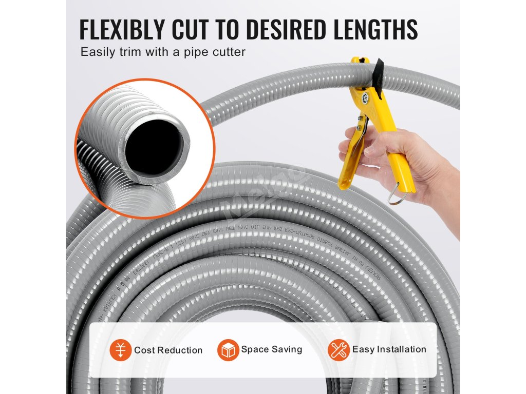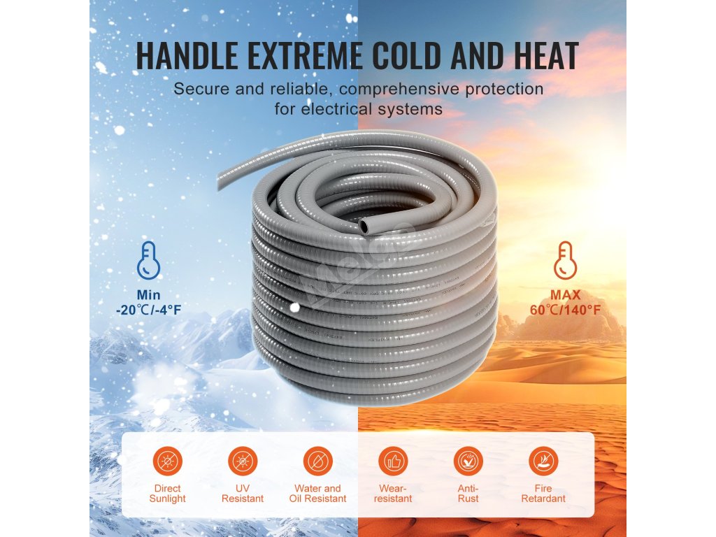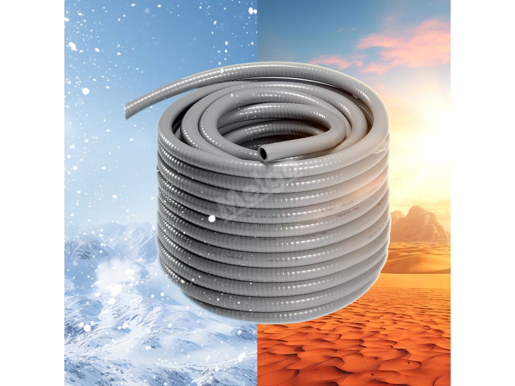 Naše flexibilní potrubí z PVC nepropustné pro kapaliny se vyznačuje výjimečnou trvanlivostí, pevností v tahu a odolností proti stlačení, takže je ideální pro drsné venkovní podmínky. Odolává přímému slunečnímu záření a lze ji zakopat pod zem, čímž poskytuje vynikající ochranu vám i vašemu elektrickému zařízení.