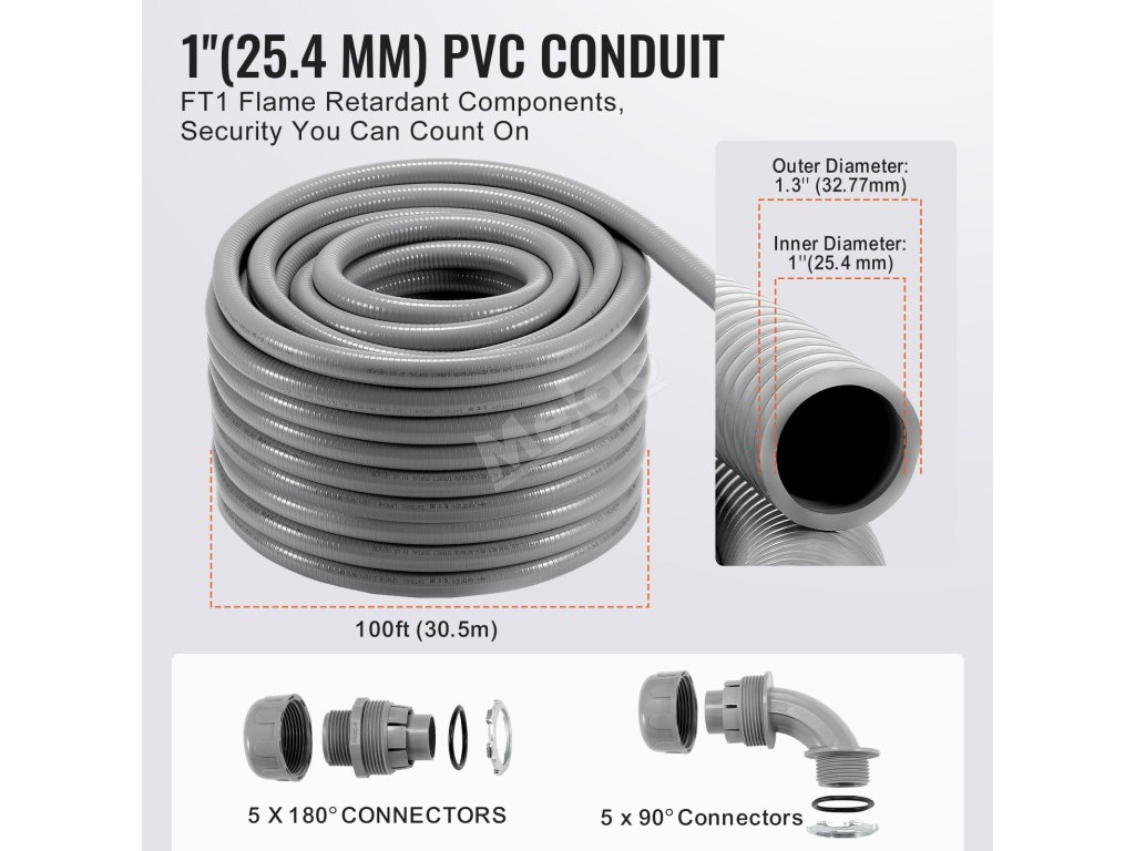 Naše potrubí z PVC je lehčí a pružnější než kovové potrubí a je ideální pro stísněné a složité prostory. Je navrženo s ohledem na trvanlivost a výborně odolává korozi způsobené kyselinami, kovovými pilinami a drsným prostředím. Díky vodotěsnosti IP65 zaručuje vynikající ochranu proti kapalinám.