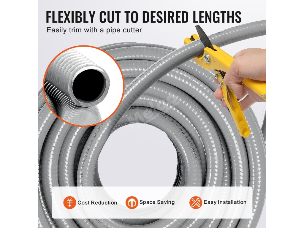 Naše 100metrové flexibilní elektrické vedení nabízíme ve třech praktických velikostech: 1/2" (12,7 mm), 3/4" (19,1 mm) a 1" (25,4 mm). Tato rozmanitost zaručuje, že najdete ideální volbu pro potřeby vašeho konkrétního projektu, díky čemuž je instalace efektivnější a přizpůsobená vašim požadavkům.