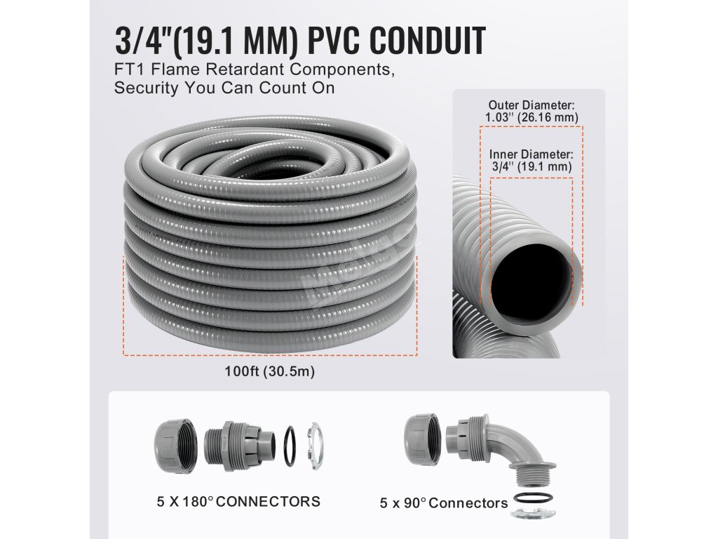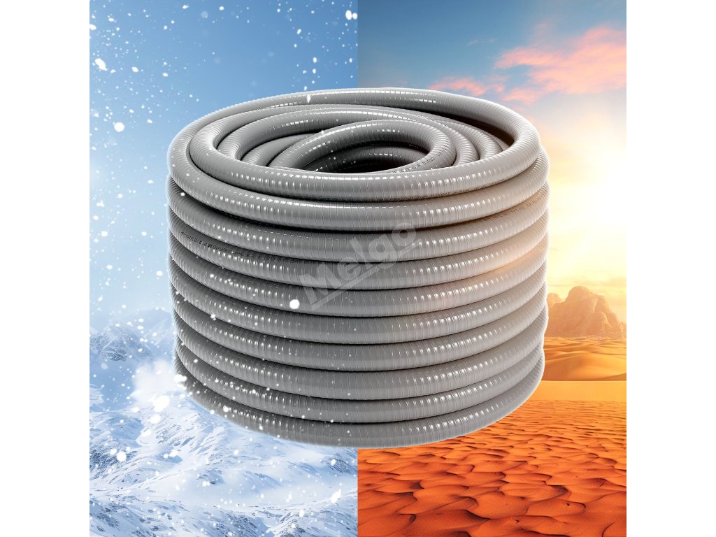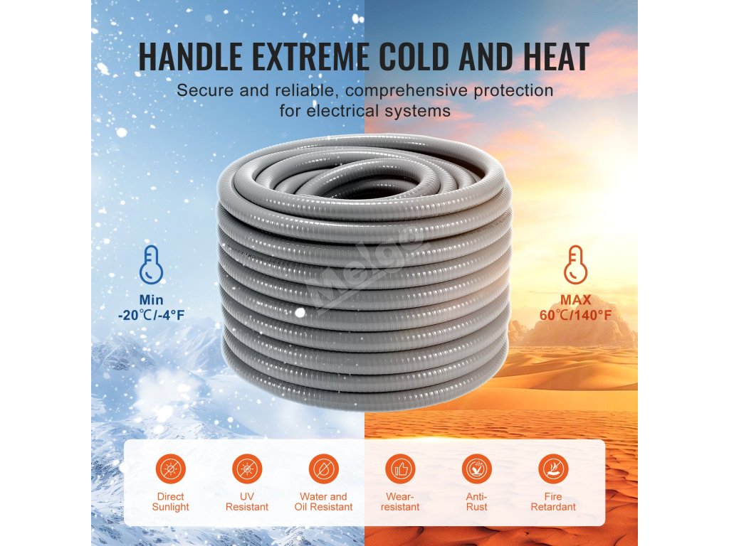 Naše flexibilní potrubí z PVC nepropustné pro kapaliny se vyznačuje výjimečnou trvanlivostí, pevností v tahu a odolností proti stlačení, takže je ideální pro drsné venkovní podmínky. Odolává přímému slunečnímu záření a lze ji zakopat pod zem, čímž poskytuje vynikající ochranu vám i vašemu elektrickému zařízení.