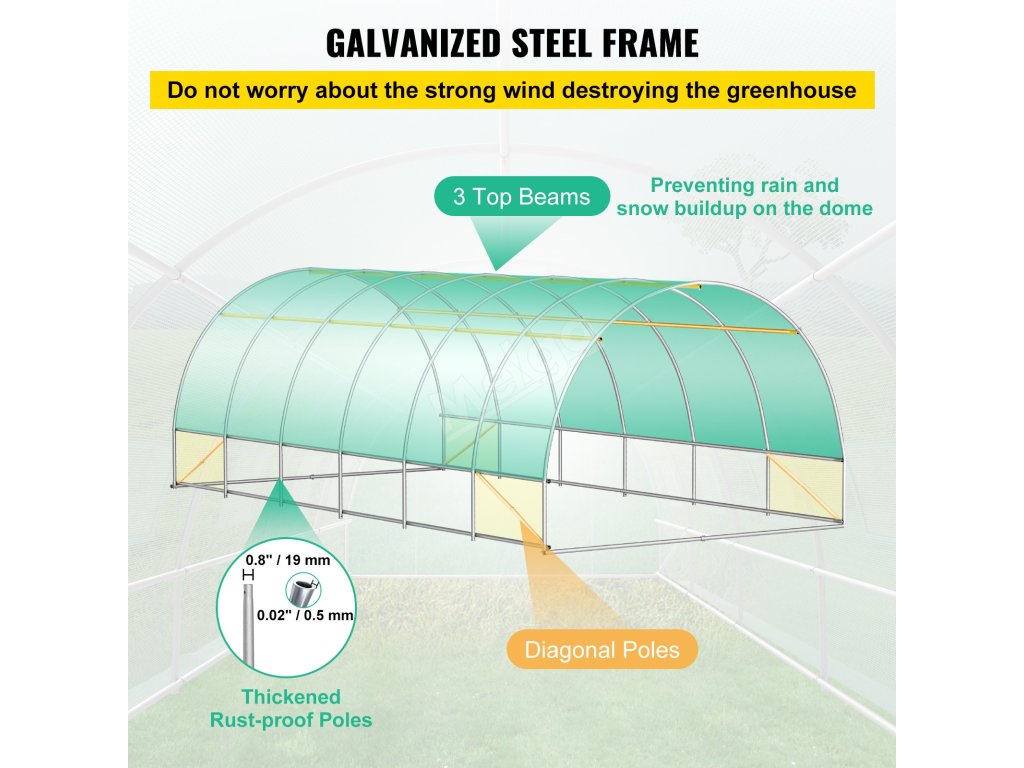 Tento skleník s vysokým tunelem využívá vylepšené, odolné obruče o tloušťce 0,02" a průměru 0,8". Pozinkovaná povrchová úprava je odolná proti korozi pro dlouhodobé používání.