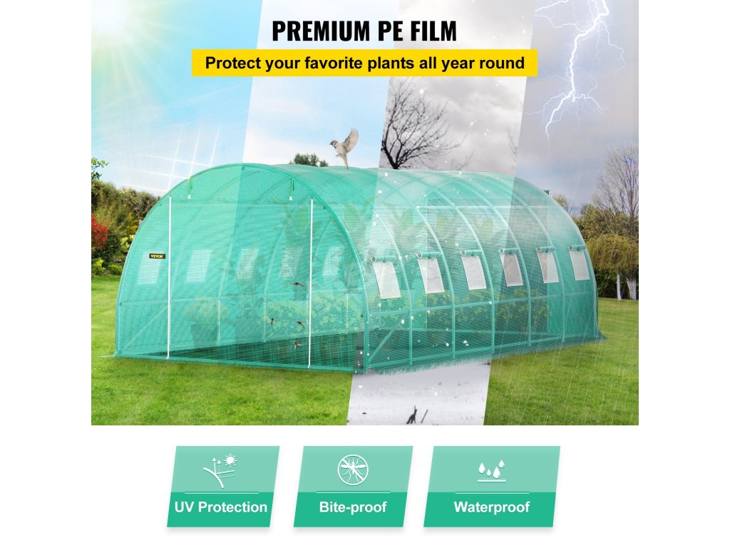 Náš obručový skleník používá vylepšený PE potah o hmotnosti 140 g/cm³, který je odolný proti uštknutí, sněhu, vodě a UV záření.
