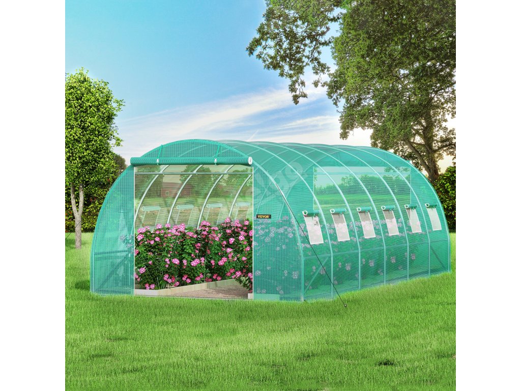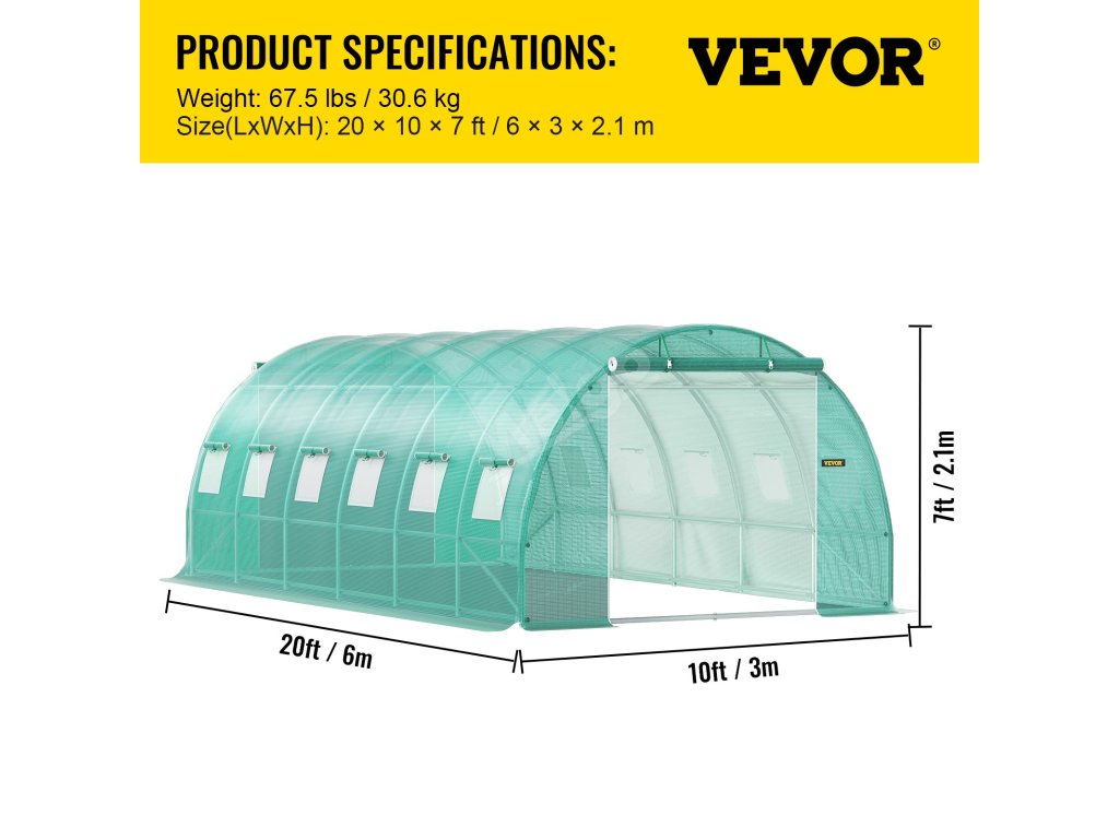 Rozměry: 20 x 10 x 7 stop / 6,1 x 3 x 2,1 m. Náš tunelový skleník má velký úložný prostor se 2 dveřmi a 12 okny se síťovinou, které zvyšují proudění vzduchu a pomáhají rostlinám prospívat.