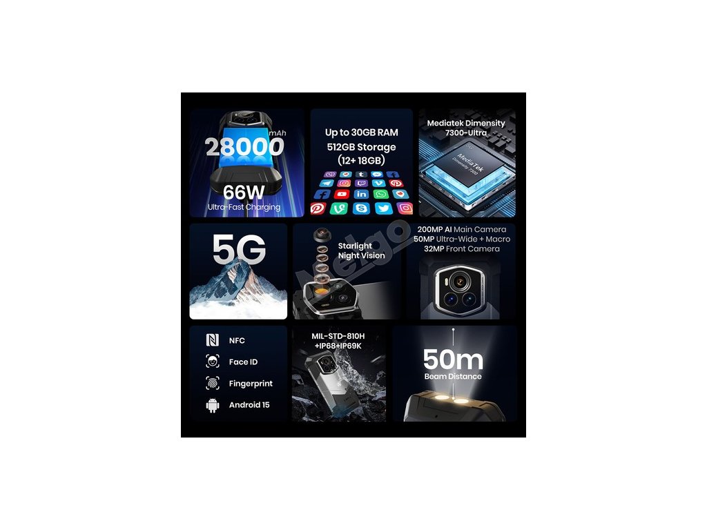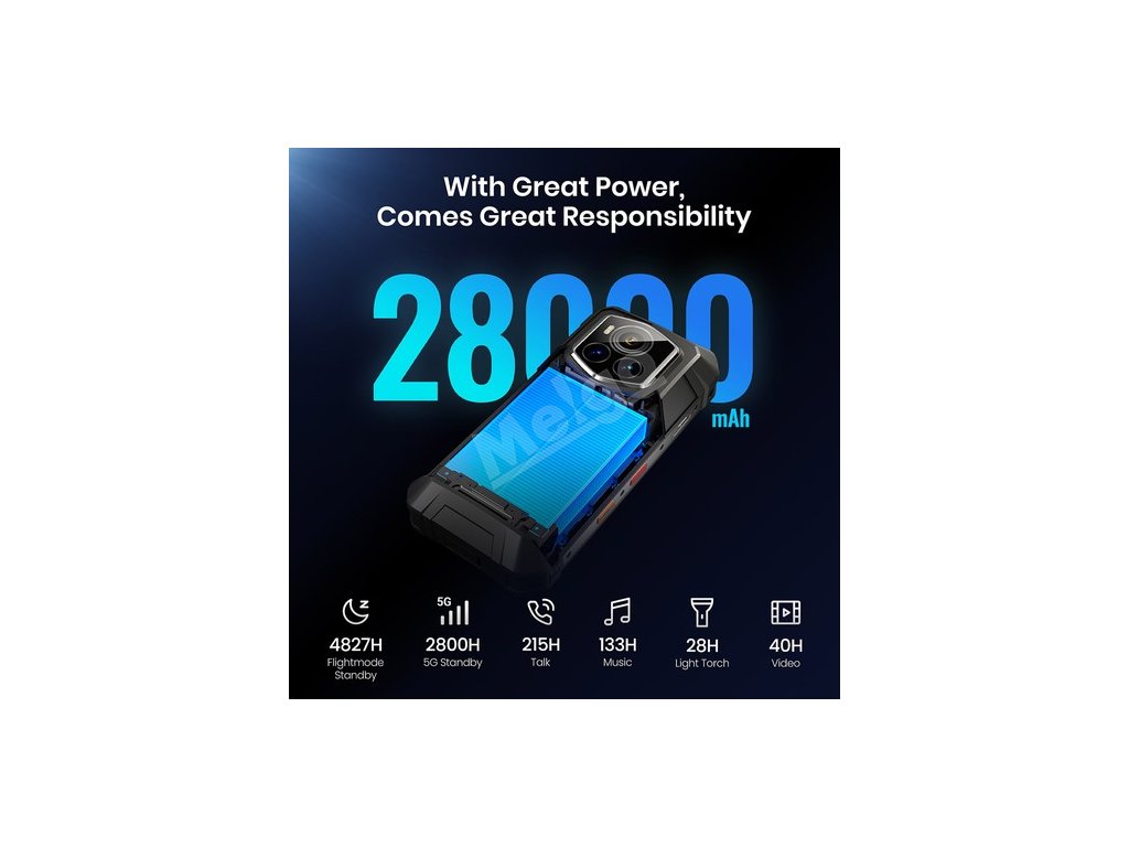 Díky masivní 28 000mAh baterii, která nabízí 28 dní provozu na baterku nebo 2800 hodin hovoru, vám nikdy nedojde energie. Díky 66W ultrarychlému nabíjení rychle doplníte energii a 10W reverzní nabíjení udrží vaše základní zařízení v provozu i v přírodě.