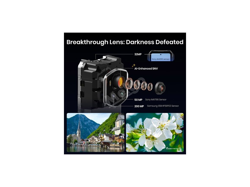 Zachyťte každý detail pomocí 200Mpx hlavního fotoaparátu s umělou inteligencí, 50Mpx širokoúhlého/makroobjektivu a 32Mpx předního fotoaparátu. Exkluzivní systém nočního vidění Starlight Night Vision (SNV) poskytuje plnobarevné fotografie v naprosté tmě, čímž překonává tradiční infračervené noční vidění.