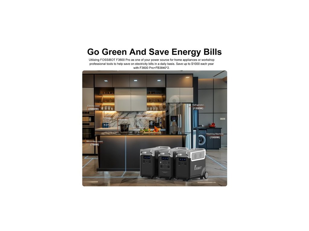 FOSSiBOT F3600 Pro je vybaven základní vysokokapacitní 3840Wh baterií s možností rozšíření až na 11520Wh připojením dvou dalších baterií, což poskytuje působivý vysoký výkon 3600 W.