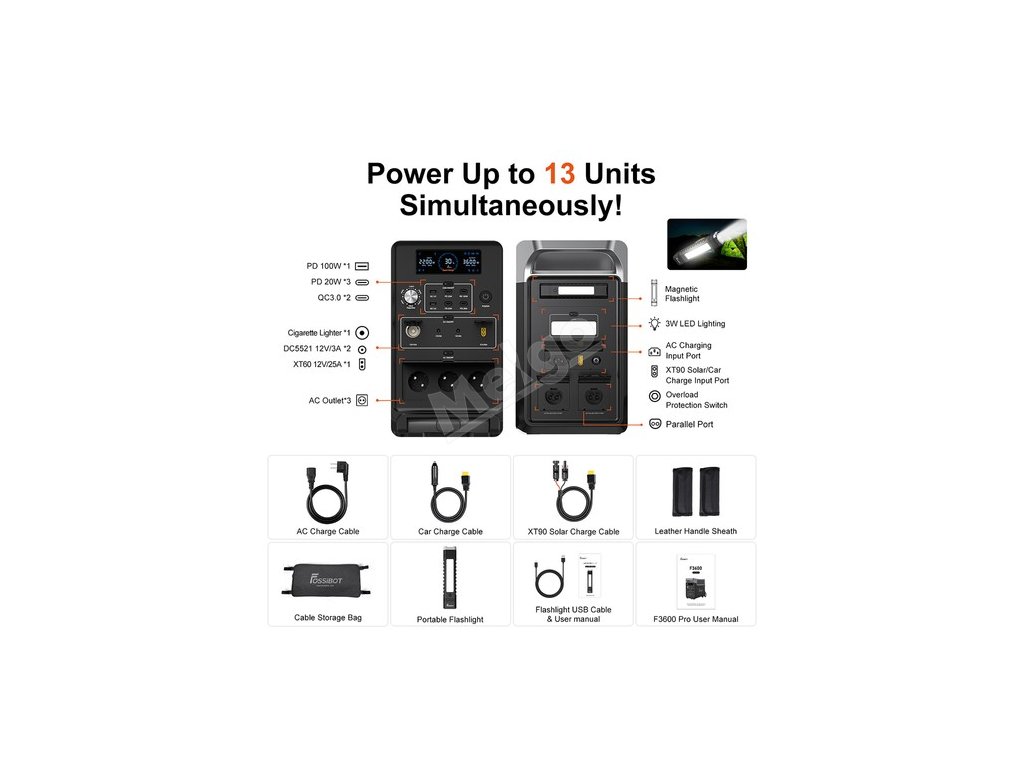 Model F3600 Pro je vybaven rozsáhlou sadou nabíjecích portů, včetně 1x PD 100W, 3x PD 20W, 2x QC3.0, 1x zásuvky zapalovače cigaret, 2x DC5521 12V/3A, 1x XT60 12V/25A a 3x zásuvky AC. Díky této rozsáhlé konektivitě je kompatibilní prakticky s jakýmkoli zařízením, od notebooků a chytrých telefonů až po větší spotřebiče a nářadí.