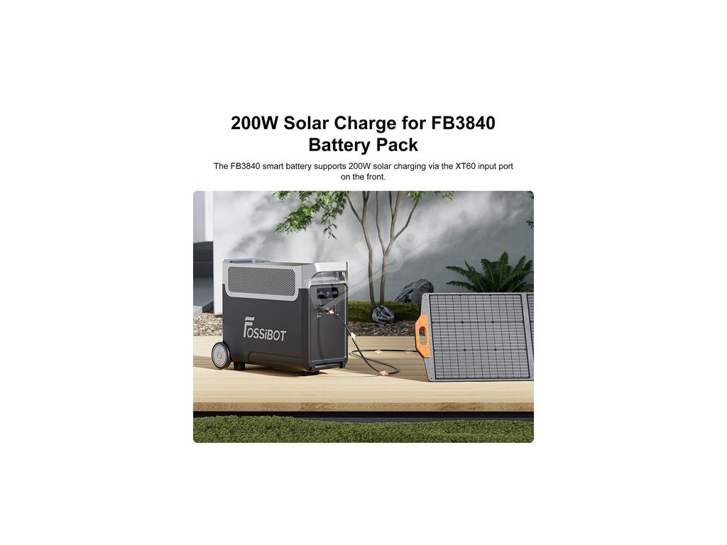 Rozšiřitelnou bateriiFB3840 lze dobíjet pomocí 200W solárního panelu nebo autem. Po připojení k FOSSiBOT F3600 Pro může využívat všechny metody nabíjení F3600 Pro.